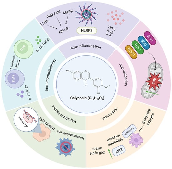 The diagram summarizes the roles and mechanisms of calycosin in inflammatory diseases. Calycosin exhibits multiple pharmacological effects, including anti-inflammatory (by inhibiting the NF-κB pathway and NLRP3 inflammasome), antioxidant (by increasing antioxidant enzyme levels and eliminating ROS), anti-cancer (by inducing apoptosis and inhibiting EMT and cell growth), hepatoprotective (by activating FXR) and immunomodulatory (by balancing Treg and Th cell function). Akt—serine/threonine kinase; EMT—epithelial–mesenchymal transition; FXR—farnesoid X receptor; GSH—glutathione; HO-1—heme oxygenase-1; IL—interleukin; MAPK—mitogen-activated protein kinase; miR—microRNA; NF-κB—nuclear factor kappa-B; NLRP3—NOD-like receptor 3; NQO1—NAD(P)H dehydrogenase quinone 1; PI3K—phosphatidylinositol three kinase; ROS—reactive oxygen species; SOD—superoxide dismutase; TGF—transforming growth factor; Th—T helper; TLR—toll-like receptor; TNF-α—tumor necrosis factor α; and Treg—Regulatory T. Green downward arrows indicate reduction.