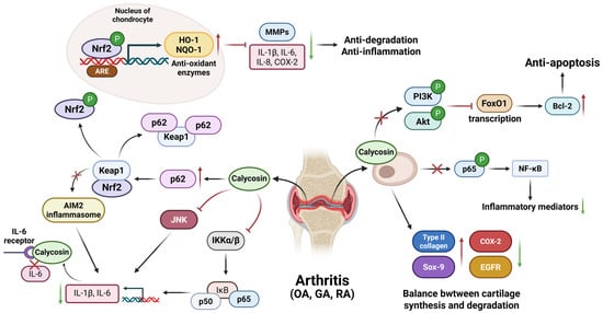 The general mechanism for calycosin-treated osteoarthritis, gouty arthritis, and rheumatoid arthritis. Calycosin in osteoarthritis interferes with cell apoptosis and inflammation, respectively, by suppressing the PI3K/Akt/FoxO1 pathway and inhibiting p65 phosphorylation. Also, it maintains the balance of cartilage synthesis and degradation by regulating type II collagen, Sox-9, COX-2, and EGFR molecules. In gouty arthritis, calycosin inhibits NF-κB while activating p62/Keap1 pathways to prevent subsequent AIM2 inflammasomes-induced inflammatory responses. In rheumatoid arthritis, calycosin mainly activates the p62/Nrf2 pathway to up-regulate antioxidant enzymes’ expression against inflammation, including HO-1 and NQO-1. It also inhibits JNK and IKK α/β to reduce the production of inflammatory cytokines, IL-1β, IL-6, etc. AIM2—absent in melanoma 2; ARE—antioxidant response element; COX-2—cyclooxygenase-2; EGFR—epidermal growth factor receptor; FoxO1—forkhead box O1; GA—gouty arthritis; HO-1—heme oxygenase-1; IKK—IκB kinase; IL—interleukin; JNK—c-Jun N-terminal kinase; Keap1—Kelch-like ECH-associated protein 1; NQO-1—NAD(P)H dehydrogenase quinone 1; Nrf2—nuclear factor-erythroid 2-related factor 2; OA—osteoarthritis; PI3K/Akt—phosphatidylinositol three kinase serine/threonine kinase; RA—rheumatoid arthritis; and Sox-9—SRY-Box Transcription Factor 9. The red upward arrows indicate increases, the green downward arrows indicate decreases, and cross marks represent inhibition.