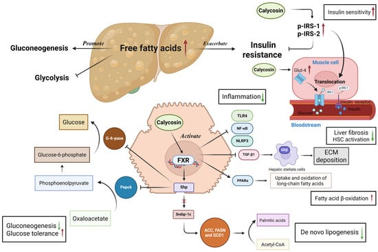 To attenuate the development of NAFLD, calycosin acts as an FXR agonist to regulate the metabolism of lipids and glucoses and improves glucose tolerance and insulin resistance. FXR is a member of the nuclear receptor family, and is important for lipid metabolism and glucose homeostasis []. In the high fat diet-induced NAFLD model of C57BL/6J male mice, a daily oral gavage of 50 mg/kg calycosin robustly activates the FXR. Ligand-bound FXR transcriptionally up-regulates the small heterodimer partner (Shp), which, in turn, suppresses the expression of the lipogenic master regulator Sterol-regulatory element binding protein 1c (Srebp-1c) and the gluconeogenic enzymes Phosphoenolpyruvate carboxykinase (Pepck) and Glucose-6-phosphatase (G-6-pase). Consequently, de novo lipogenesis and hepatic gluconeogenesis are inhibited. Concomitantly, calycosin elevates the insulin-sensitizing proteins Glucose transporter 4 (Glut-4) and Glycogen synthase kinase 3 beta (Gsk3β), enhancing peripheral glucose uptake and glycogen synthesis, thereby ameliorating both glucose tolerance and insulin resistance []. Through FXR activation, calycosin also inhibits the synthesis of glyceride and increases fatty acid β-oxidation to attenuate lipid accumulation, and reduces the production of collagen I to mitigate liver fibrosis in a NASH mouse model, showing a dose-dependent relationship of 12.5, 25, and 50 mg/kg []. Meanwhile, calycosin can increase estrogen receptor β (ERβ) expression, and then activate the subsequent Janus kinase 2 (JAK2)-STAT3 to inhibit hepatic stellate cells’ activation and collagen deposition against carbon tetrachloride-induced liver fibrosis [,,,]. Bioinformatic and biochemical findings show that ALDH2, Niemann pick C1 (NPC1), and high mobility group protein 1 (HMGB1), which are responsible for lipid degradation and lipid homeostasis, may represent new therapeutic targets of calycosin in treatments against hepatic steatosis []. The early management of dietary changes and medical treatment, such as the use of calycosin, can reverse pathological changes in the liver in time rather than letting it develop into severe cirrhosis [].
