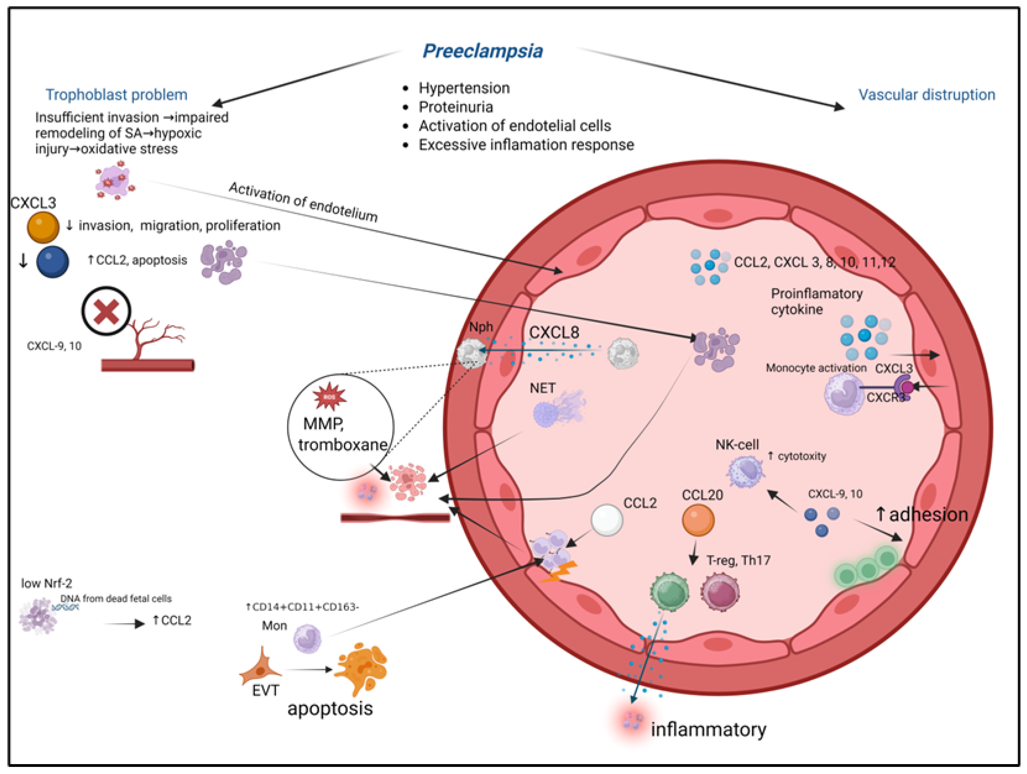 - Immune Activation and Vascular Dysfunction. These placental chemokines recruit and activate maternal neutrophils and monocytes into the intervillous space and systemic circulation. Activated immune cells exacerbate local damage, induce endothelial dysfunction, and contribute to a systemic inflammatory response.