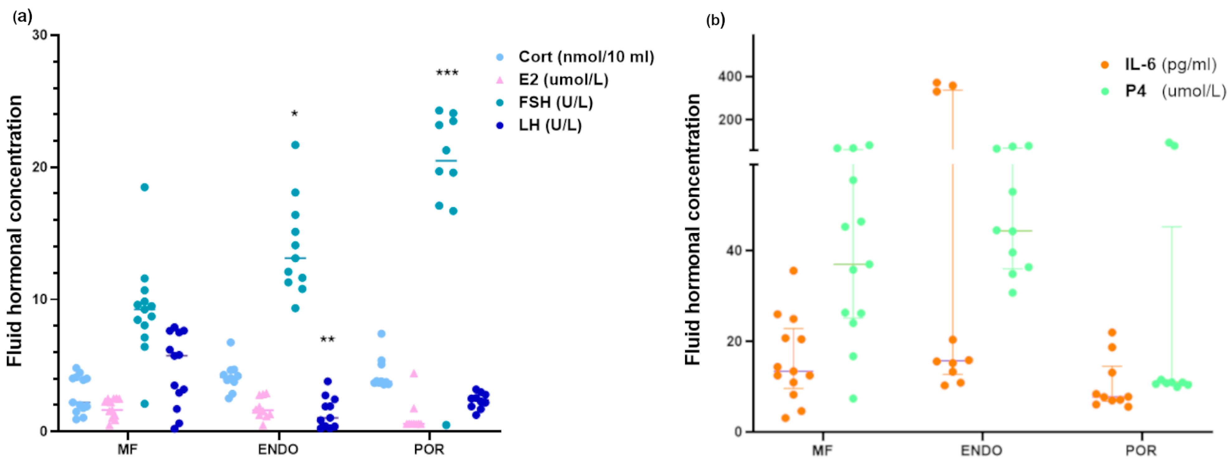 Figure 2. Hormonal and IL-6 parameters were analyzed in follicular fluid samples collected at oocyte pick-up. The content of hormones and the cytokine IL-6 was assessed as described in the Methods; (a) Hormone concentrations; (b) IL-6 and P4 levels. Because most datasets deviated from normality according to the Shapiro–Wilk test, statistical analysis was conducted using the Kruskal–Wallis test followed by Dunn’s multiple-comparisons test (vs. MF group). * p < 0.05; ** p < 0.01; *** p < 0.001. Data represent individual follicular fluid samples (n = 9–14 per group, depending on parameter). Cort: cortisol; E2: estradiol; FSH: follicle-stimulating hormone; LH: luteinizing hormone; P4: progesterone.