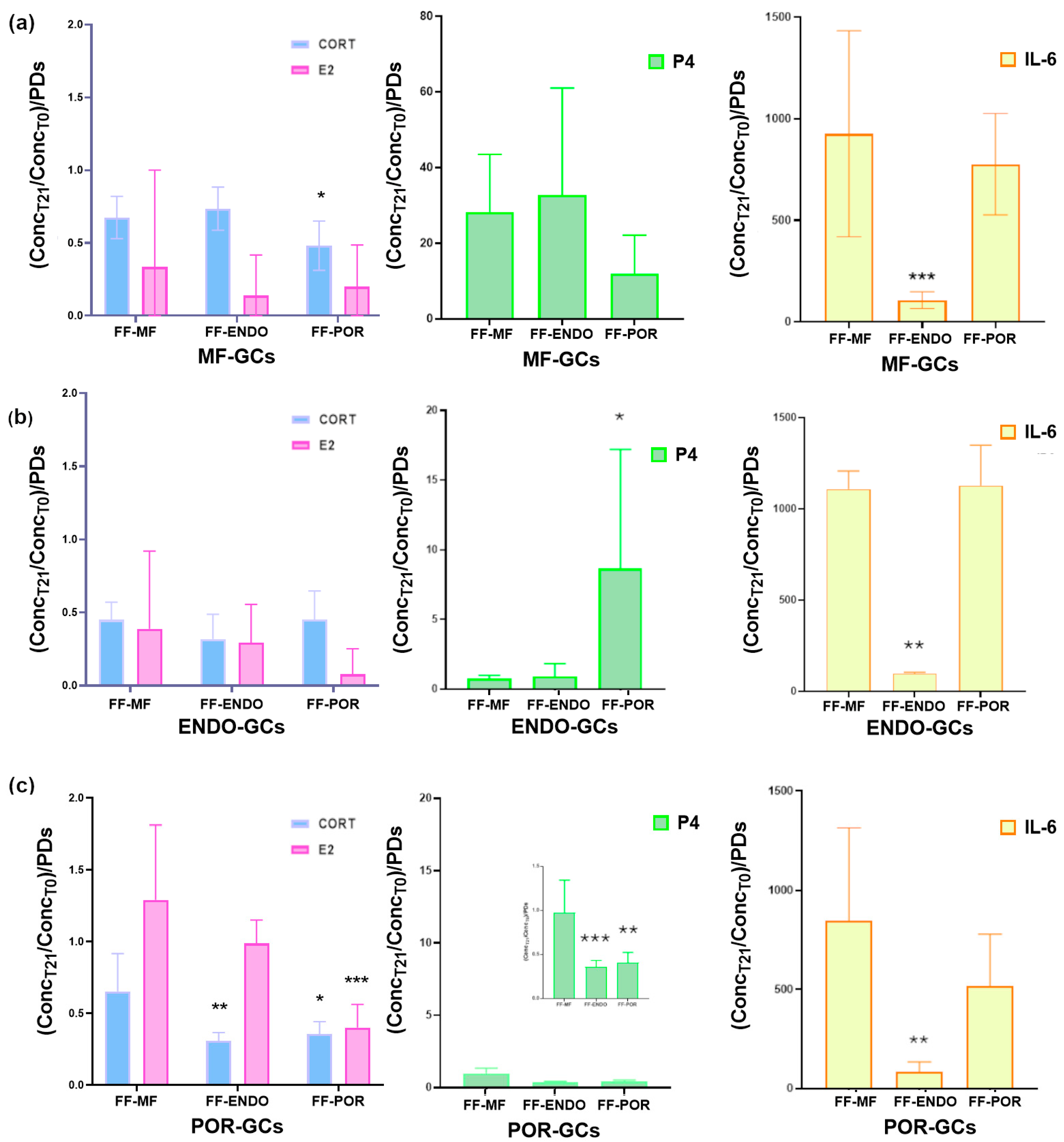 Figure 5. Modulation of hormone and cytokine levels in culture supernatants of granulosa cells (GCs) treated with FF. GCs from MF (a), ENDO (b), and POR (c) patients were cultured for 3 weeks in the presence of FF-MF, FF-ENDO, or FF-POR, as described in Methods. Five days before the end of culture, medium replacement was stopped, and conditioned culture medium (CCM) was collected, centrifuged, and analyzed for cortisol (CORT, blue), estradiol (E2, pink), progesterone (P4, green), and IL-6 (yellow) content. Data were normalized to the corresponding baseline concentrations in each supplemented medium (FF-MF, FF-ENDO, FF-POR) and to the relative PDs in the same conditions, and expressed as relative consumption or release ([Hormone or IL-6]f/[Hormone or IL-6]i × 1/PDs). Values represent mean ± SD from at least six independent experiments per group. Statistical analysis was performed by one-way ANOVA followed by Dunnett’s post hoc test (comparison vs. MF group) or with Kruskal-Wallis test followed by Dunn’s test in case of non-normal data. * p < 0.05; ** p < 0.01; *** p < 0.001.