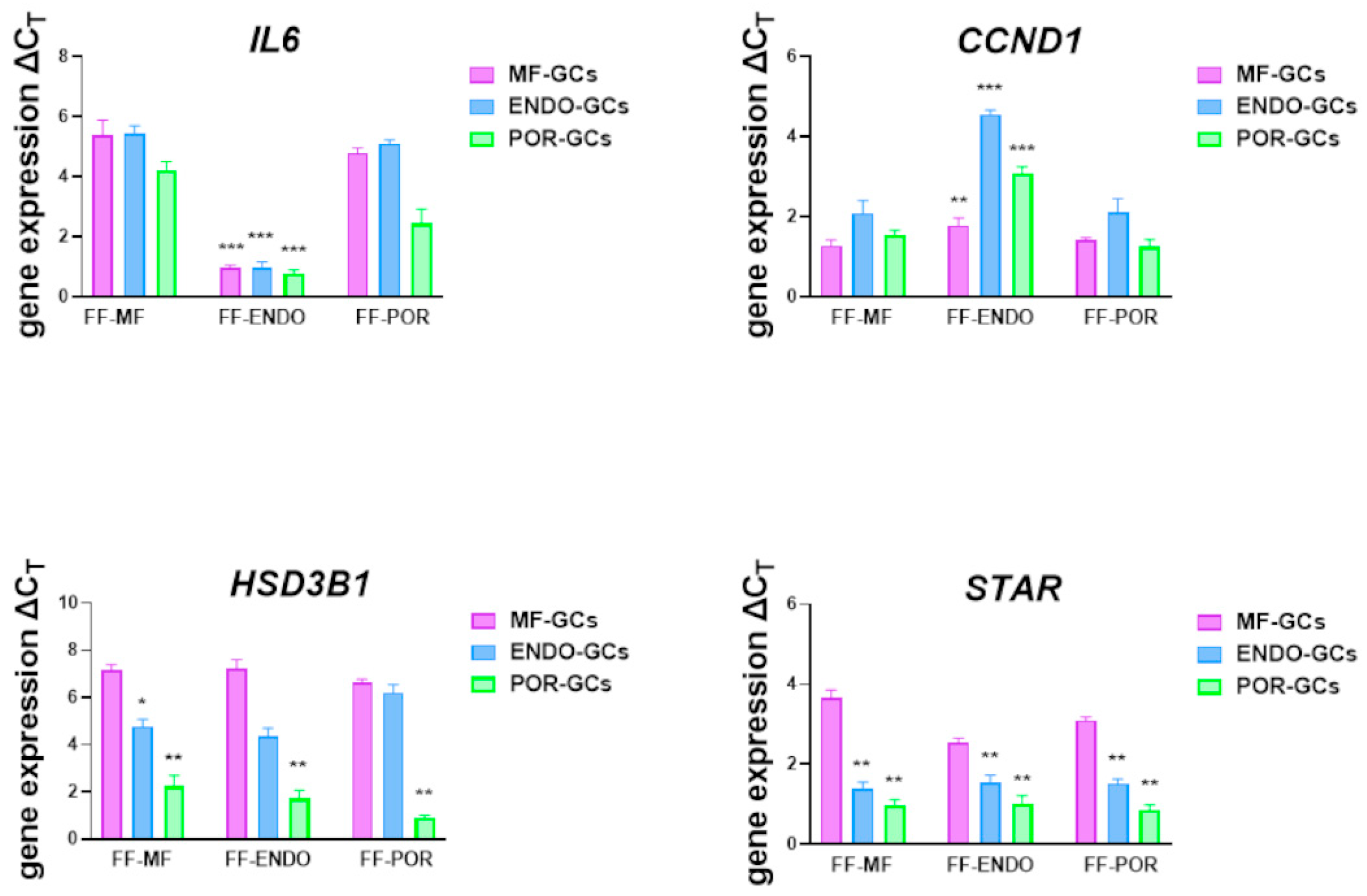 Figure 7. Modulation of gene expression in GCs treated with the three different FF-media. GCs from MF (violet), ENDO (light blue), and POR (green) patients were cultured for 3 weeks in the presence of FF-MF, FF-ENDO or FF-POR as described in Methods. At the end of culture, cells were collected and subjected to total RNA extraction. Quantitative real time PCR was performed to evaluate the gene expression levels of IL-6, (IL-6), cyclin D1 (CCND1), hydroxy-Delta-5-steroid dehydrogenase, 3 Beta- and Steroid Delta-Isomerase 1 (HSD3B1) and steroidogenic acute regulatory (STAR). Data were normalized to the expression of β-ACTIN gene as the internal reference and calculated using the ΔCT method. Values are reported as mean ± SEM from at least six independent experiments per group. Statistical analysis was performed by one-way ANOVA followed by Bonferroni’s multicomparison test. * denotes p < 0.05; ** denotes p < 0.01; *** denotes p < 0.001.