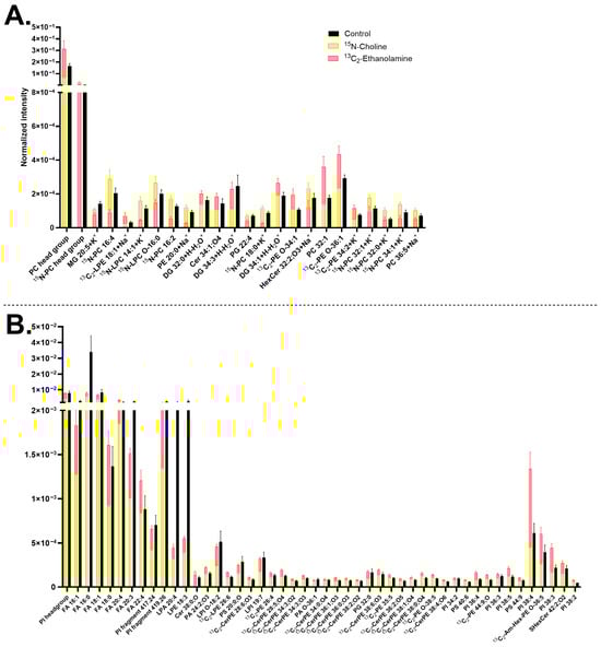 Major lipids with significantly different turnover in human midbrain neurons following 13C2-ethanolamine or 15N-choline incubation. (A) Lipids detected in positive mode and (B) lipids detected in negative mode. The 13C2-ethanolamine (pink) and 15N-choline (yellow) bars are superimposed, and the control (black) is interleaved. Lipids are arranged in each chart from left to right in ascending mass/charge (m/z). Error bars represent standard error of mean (SEM). The data of 13C2-ethanolamine and 15N-choline are significantly different from each other by a multiple Mann–Whitney test with a p-value of ≤0.05. Cells treated with either 15N-choline or 13C2-ethanolamine each had two biological replicates with seven to nine measurements per ion mode. The control had five biological replicates with 20 measurements per ion mode. 1-(1Z-alkenyl),2-acylglycerophosphoethanolamine glycan (Am-Hex-PE), ceramide (Cer), ceramide phosphoethanolamine (CerPE), diacylglycerol (DG), fatty acid (FA), hexosylceramide (HexCer), lysophosphatidic acid (LPA), lysohosphatidylcholine (LPC), lysophosphatidylethanolamine (LPE), lysophosphatidylinositol (LPI), monoacylglycerol (MG), phosphatidic acid (PA), phosphatidylcholine (PC), phosphatidylethanolamine (PE), phosphatidylglycerol (PG), phosphatidylinositol (PI), phosphatidylserine (PS), and sulfatide (SHexCer). Lipids with no annotated ionization were detected as [M+H]+ in (A) and [M–H]− in (B).