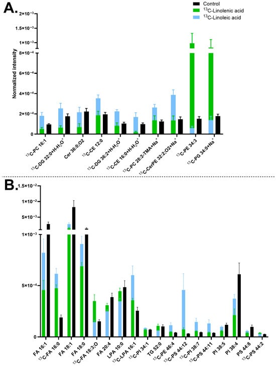 Lipid abundancy in mature human midbrain neurons upon 13C-linolenic acid and 13C-linoleic acid incubation. (A) Lipids detected in positive mode and (B) lipids detected in negative mode. Error bars represent standard error of mean (SEM). The 13C-linolenic acid (green) and 13C-linoleic acid (blue) bars are superimposed, and the control (black) is interleaved. All bars of 13C-linolenic acid and 13C-linoleic acid are significantly different from each other by a multiple Mann–Whitney test with a p-value of ≤0.05. Lipids are arranged from left to right in ascending mass per charge (m/z). Cells treated with either 13C-linolenic acid or with 13C-linoleic acid each had two biological replicates with seven to eight measurements per mode. The control had five biological replicates with 20 measurements in total per mode. Cholesterol ester (CE), ceramide (Cer), ceramide phosphoethanolamine (CerPE), diacylglycerol (DG), fatty acid (FA), lysophosphatidic acid (LPA), phosphatidylcholine (PC), phosphatidylethanolamine (PE), phosphatidylglycerol (PG), phosphatidylinositol (PI), phosphatidylserine (PS), and triglyceride (TG). Lipids with no annotated ionization were detected as [M+H+] in (A) and [M-H−] in (B).