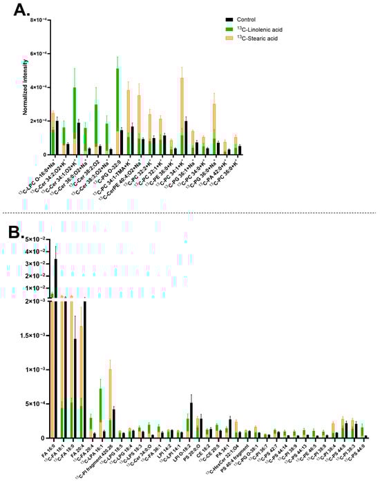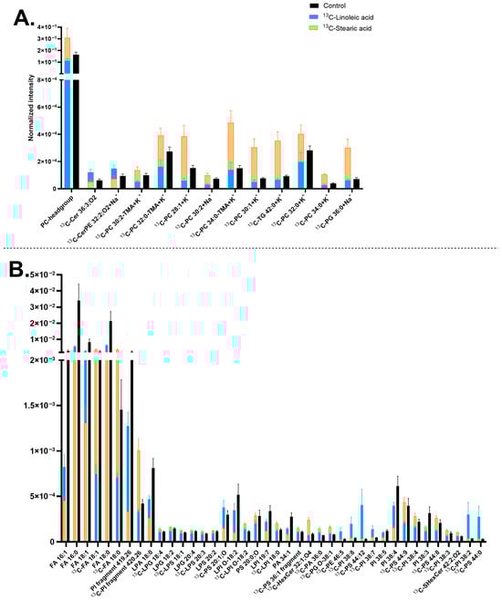 In relation to Figure 3, which compares 13C-linolenic acid and 13C-linoleic acid, some lipids were common, such as [13C-LPA 16:1-H]− at m/z 408.22, having higher abundance with 13C-linolenic acid (Figure 3B and Figure 5B). On the other hand, [13C-PI 38:4-H]− at m/z 886.55 and [13C-PS 44:8-H]− at m/z 887.56 showed higher abundance with 13C-stearic acid. In addition, comparing Figure 4 and Figure 5, similar lipids were observed, for example, [FA 16:0-H]− at m/z 255.23 with lower abundance, whereas [13C-FA 18:1-H]− at m/z 282.25, [13C-FA 18:0-H]− at m/z 284.26, and PCs having higher abundance with 13C-stearic acid.