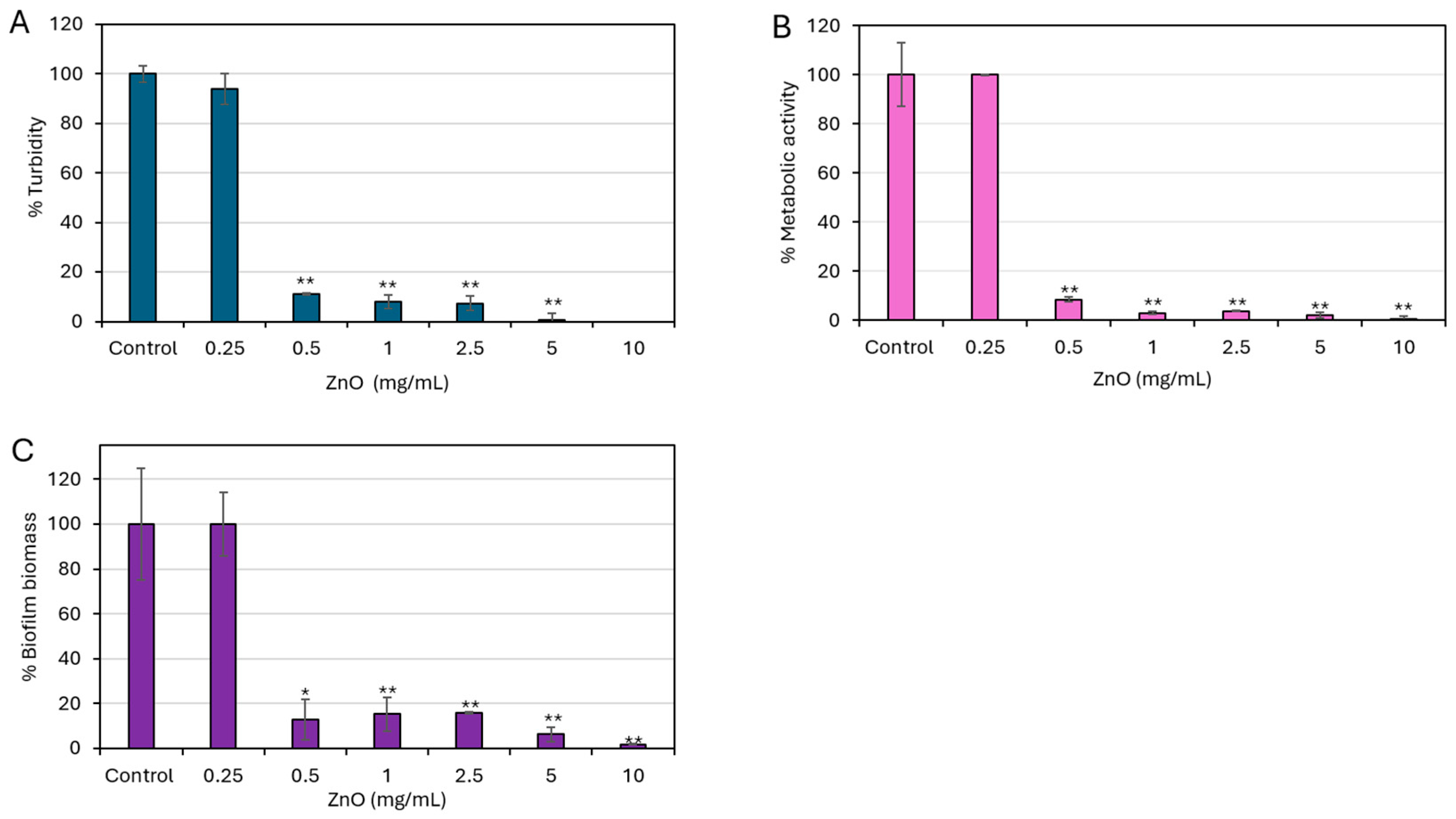 3.8. Treatment with ZnO NPs Leads to Reduced EPS Production