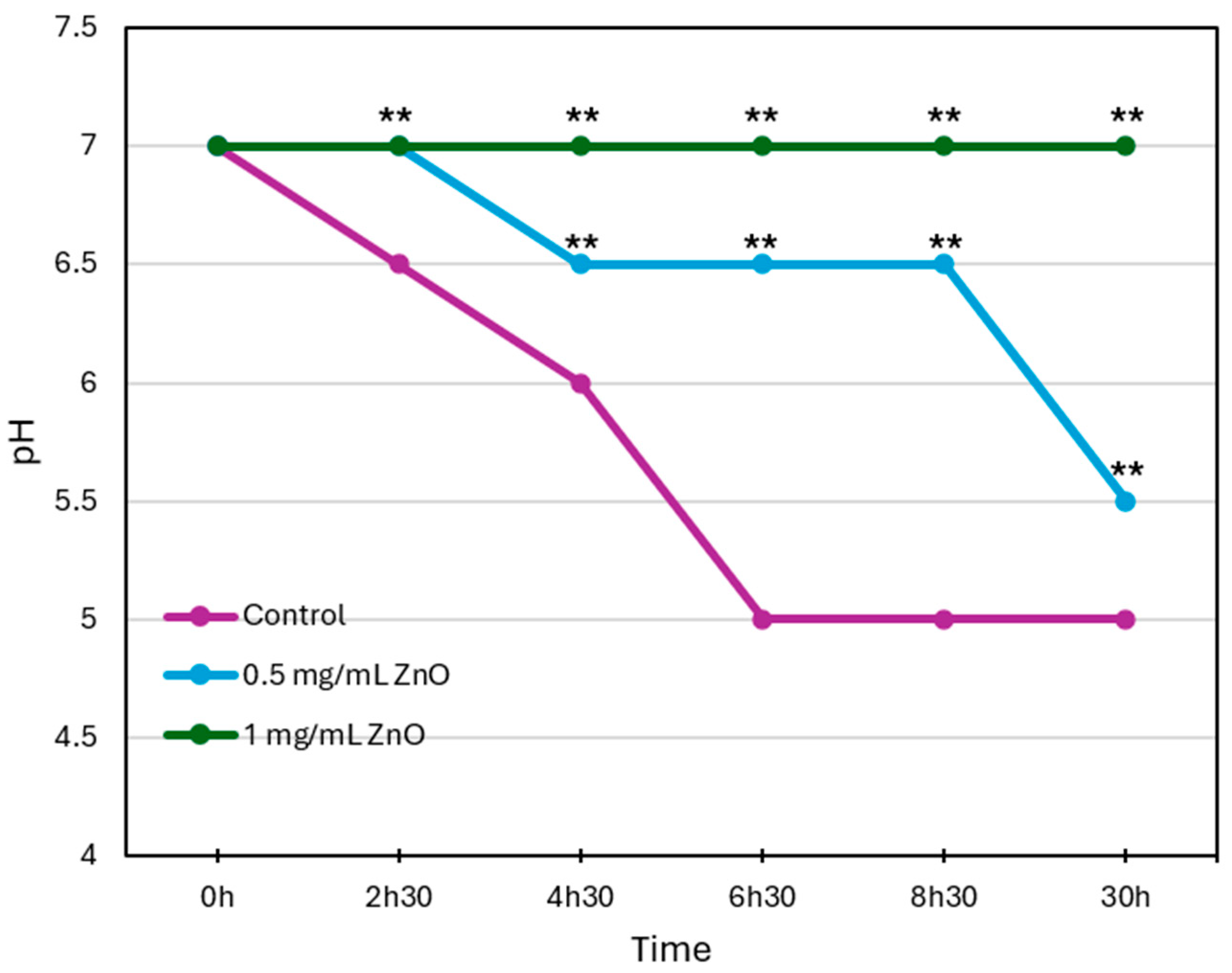 3.3. ZnO NPs Inhibit Acid Production by S. mutans in a Concentration-Dependent Manner