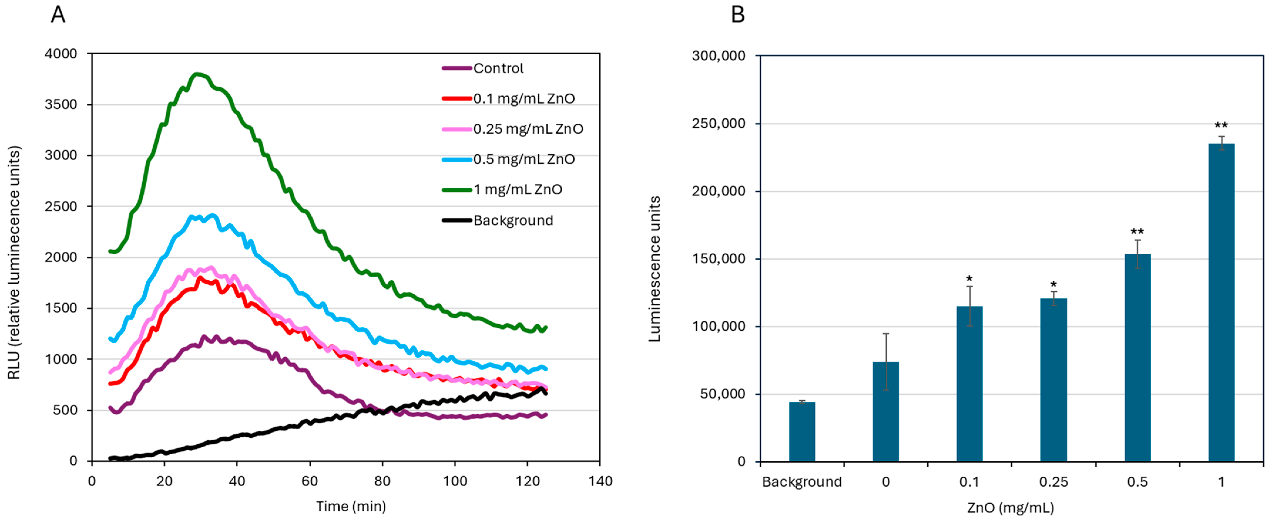 3.6. ZnO NPs Induce ROS Production