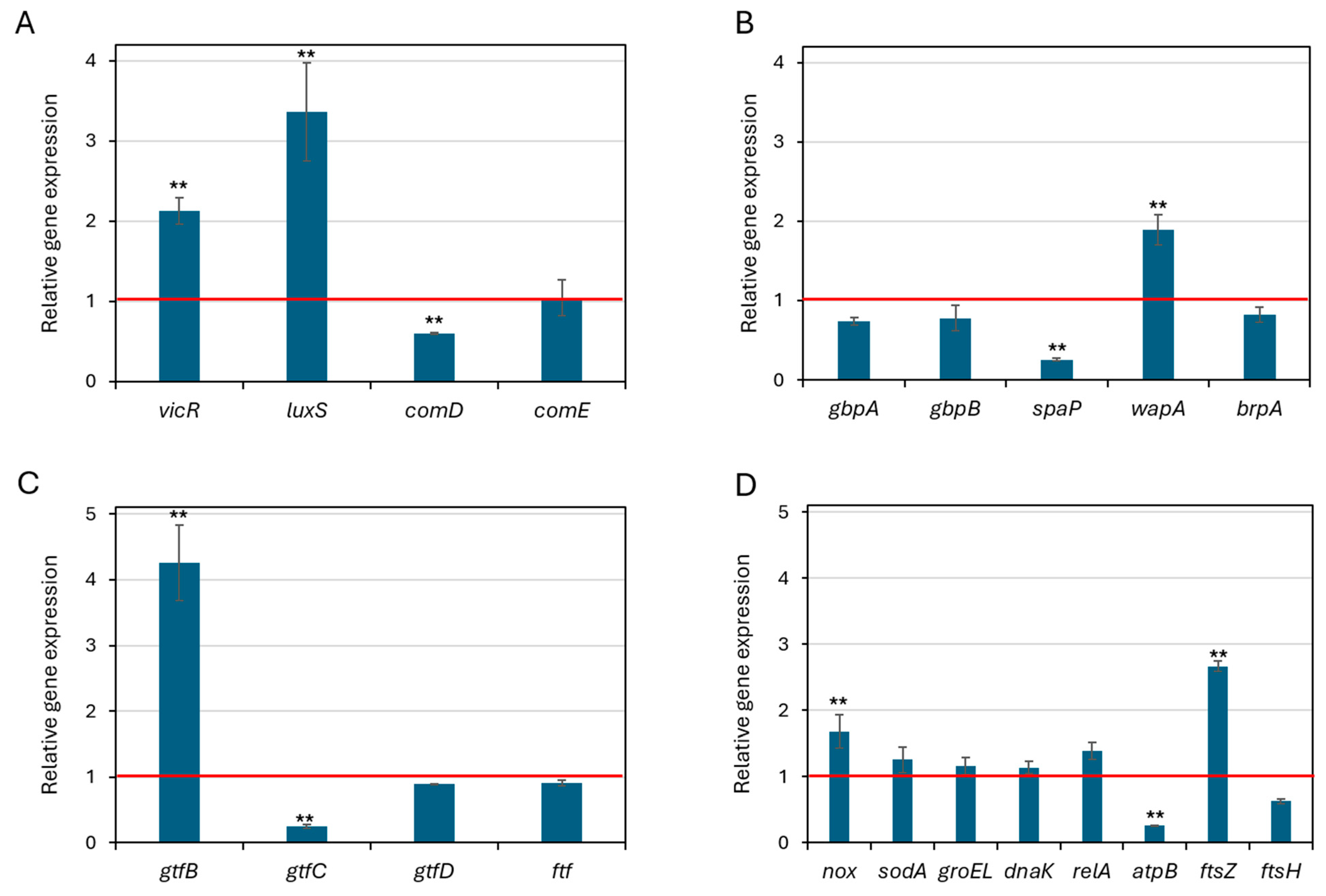 - Fitri, D.K.; Tuygunov, N.; Wan Harun, W.H.A.; Purwasena, I.A.; Cahyanto, A.; Zakaria, M.N. Key virulence genes associated with Streptococcus mutans biofilm formation: A systematic review. Front. Oral Health 2025, 6, 1654428. [Google Scholar] [CrossRef] [PubMed]