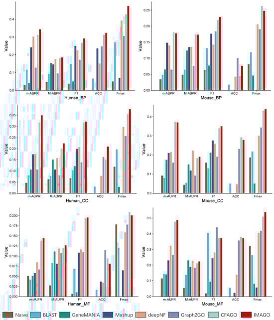 We compare IMAGO with two baseline methods and five network-based models. The naive method directly assigns the relative frequency of terms in the training set to each protein in the test set as a predictive score. Based on the sequence similarity, the BLAST method transfers the GO term of the protein in the training set to the corresponding protein in the test set through blastp and assigns it according to the comparison score. GeneMANIA [] predicts gene function through a weighted proximity algorithm, and integrates multiple data sources into a unified network to dynamically adjust the weight of each data source to optimize the prediction effect. Mashup [] generates a balanced hidden diffusion state through multi-network topology fusion, using different PPI network information. Based on MLPAE, deepNF [] embeds multiple PPI networks into a joint potential representation. Graph2GO [] combines variational graph automatic encoder (GAE) and sequence similarity network to integrate protein attributes with PPI network features for function prediction. CFAGO [] uses the Transformer-based automatic encoder (TransformerAE) to cross-fuse the PPI network and protein attributes.
