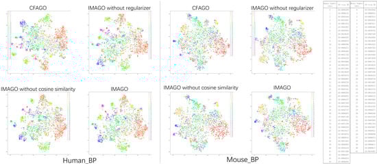 To intuitively demonstrate the quality of protein representations learned by the IMAGO model, we employed t-SNE (t-distributed Stochastic Neighbor Embedding) to project the generated protein embeddings into a two-dimensional space for visualization. As illustrated in Figure 4, which uses the Biological Process (BP) category of the human dataset as an example, distinct colors represent proteins annotated with specific GO functional terms. The visualization reveals that protein embeddings with similar functions form well-defined clusters in the projected space, while those with divergent functions are clearly separated. This pattern demonstrates that the IMAGO model effectively captures the underlying semantic relationships between protein functions, producing highly discriminative embedding representations. These qualitative results provide intuitive evidence supporting the model’s superior classification performance, as quantitatively reported in the previous sections.
