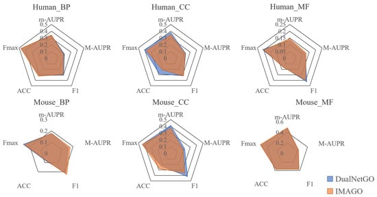 To further position IMAGO against a contemporary state-of-the-art model that addresses the same task with a complementary approach, we compare our results with DualNetGO [], another advanced model built upon the CFAGO framework (see Figure 5). While both models aim to enhance protein function prediction, their improvement strategies differ: IMAGO introduces internal regularization and optimizes the loss function to learn more robust embeddings, whereas DualNetGO employs a dual-network architecture to intelligently select features from multiple PPI network embeddings.
