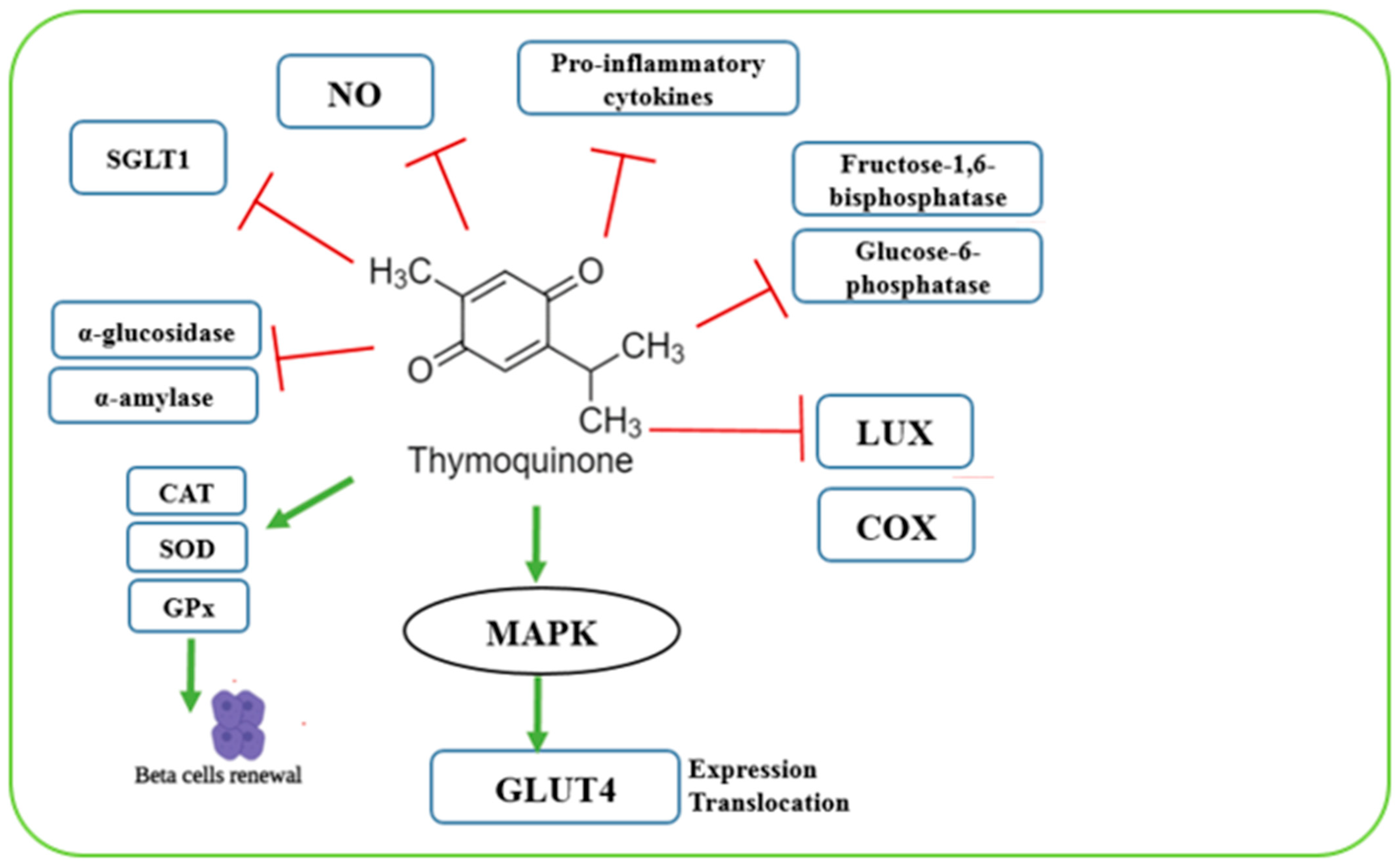 - Shaukat, A.; Zaidi, A.; Anwar, H.; Kizilbash, N. Mechanism of the antidiabetic action of Nigella sativa and Thymoquinone: A review. Front. Nutr. 2023, 10, 1126272–1126299. [Google Scholar] [CrossRef]