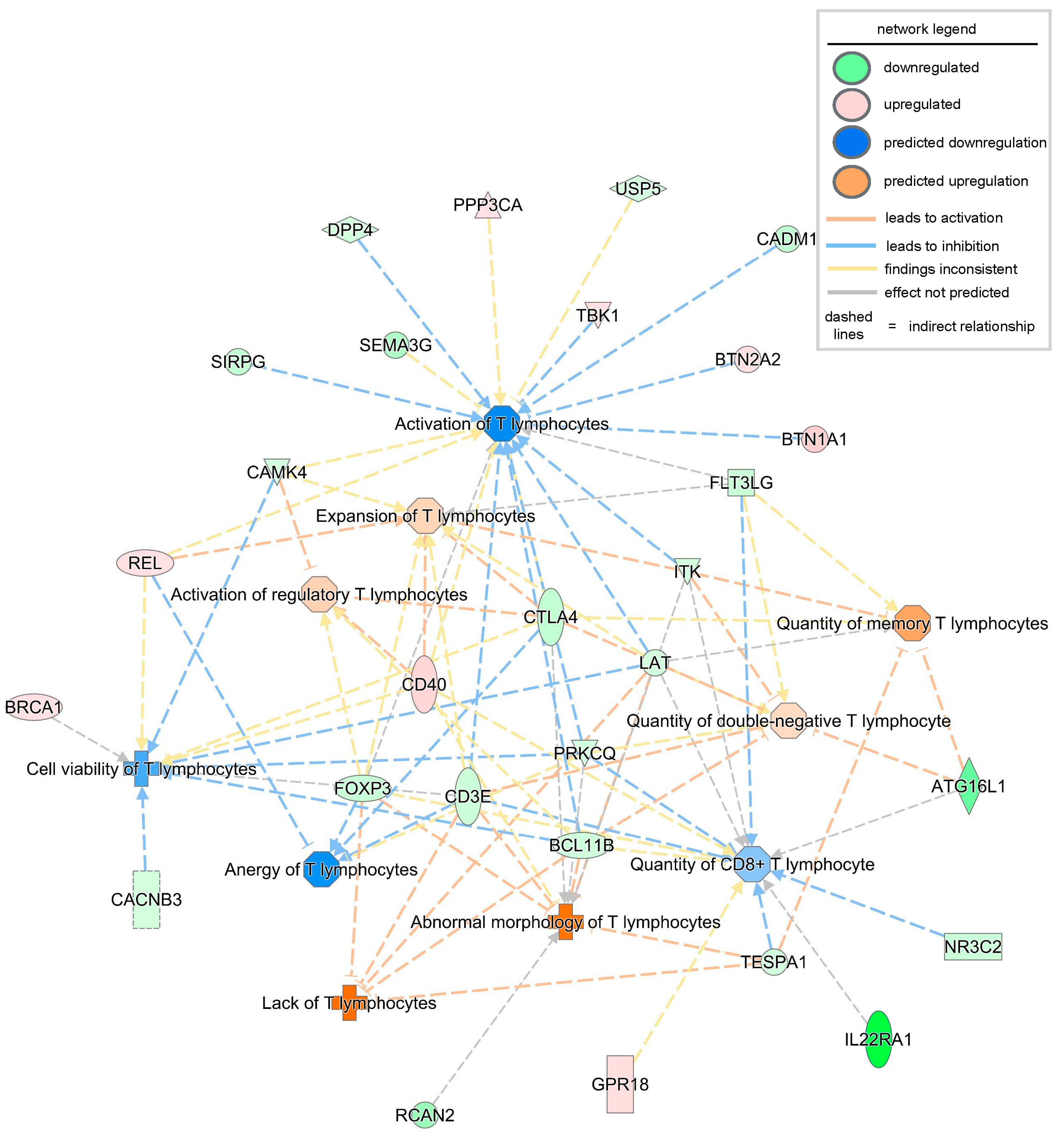 | Cell viability of T lymphocytes | 0.00027 | −0.787 | BCL11B, BRCA1, CACNB3, CAMK4, CD3E, CD40, CTLA4, LAT, PRKCQ, REL | 10 | |