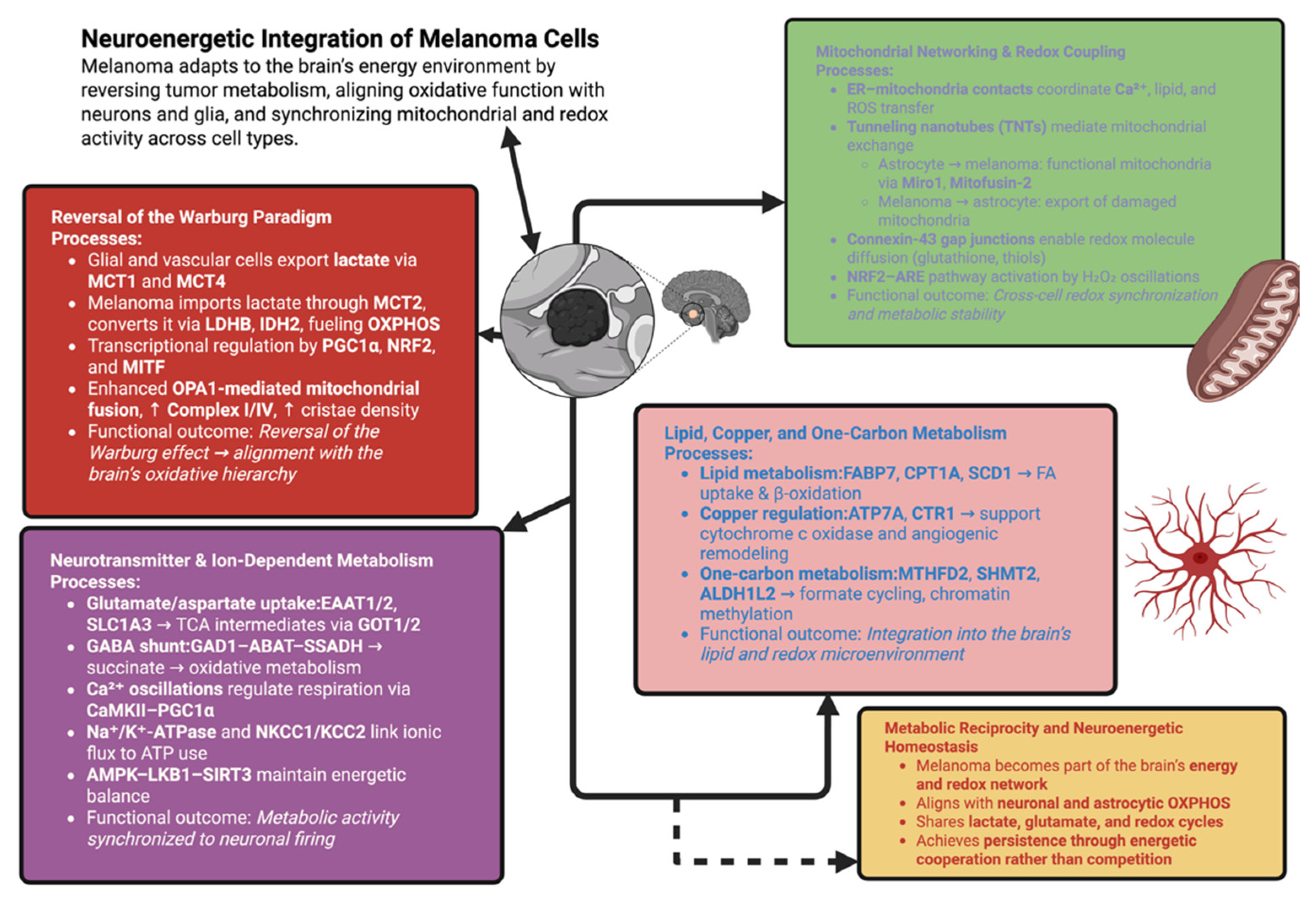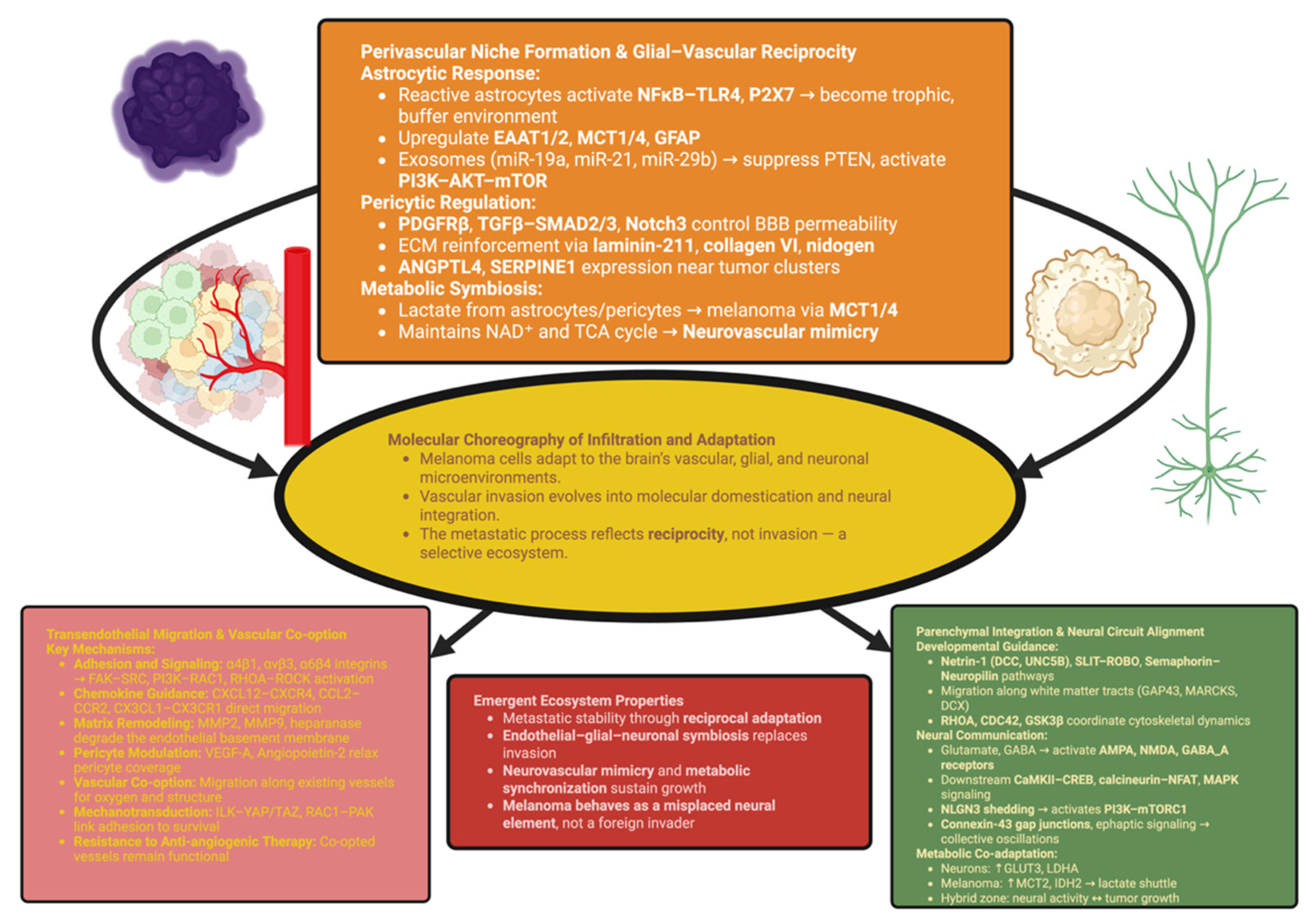 | Systems-level integration and metastasis phenotype | Emergence of hybrid “neural–melanocytic” state capable of neurotransmitter release (glutamate and ATP) and metabolic coupling with glia | Establishes partially integrated neural subsystems that exploit neuronal circuitry for survival and spread | In vivo imaging and metabolic tracing of functional connectivity within metastases | [57] |