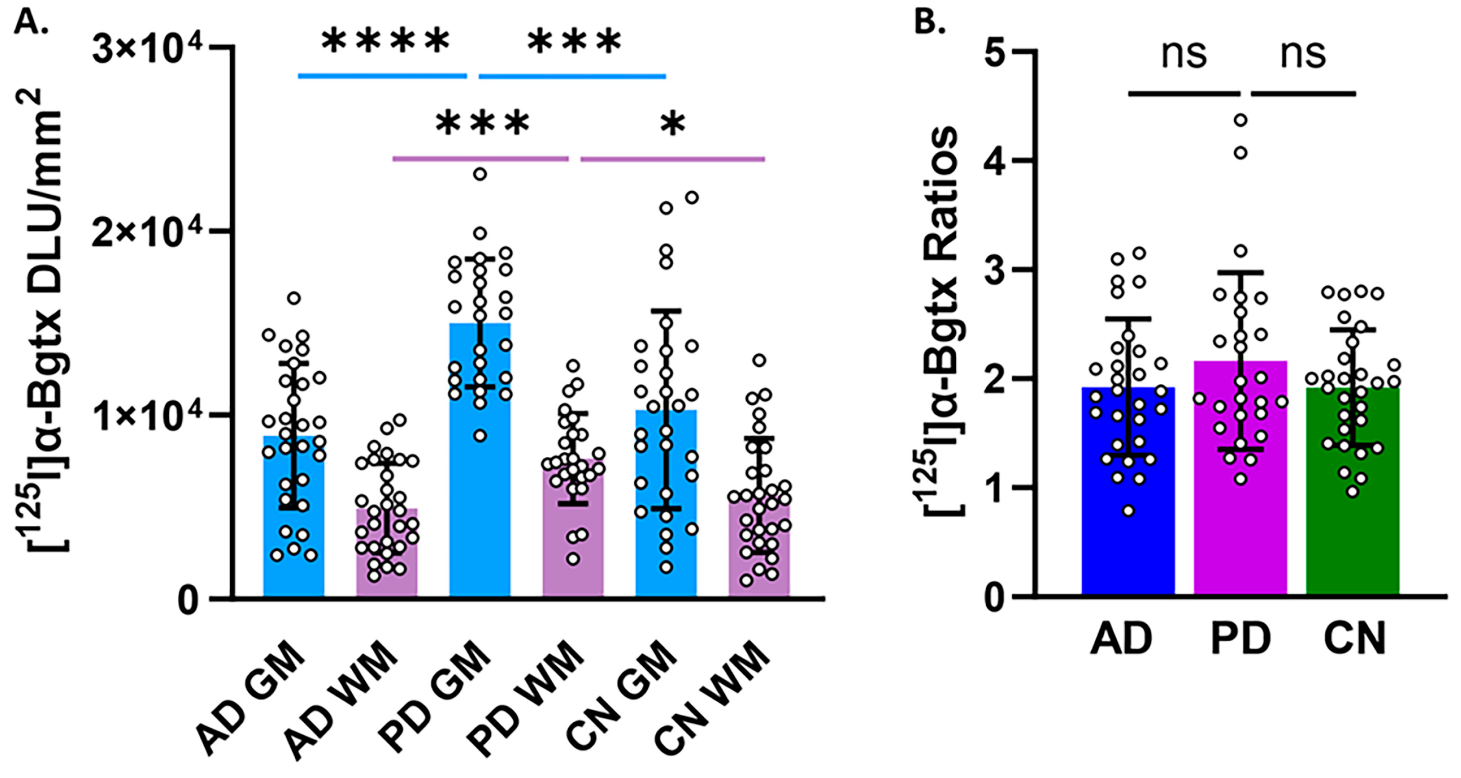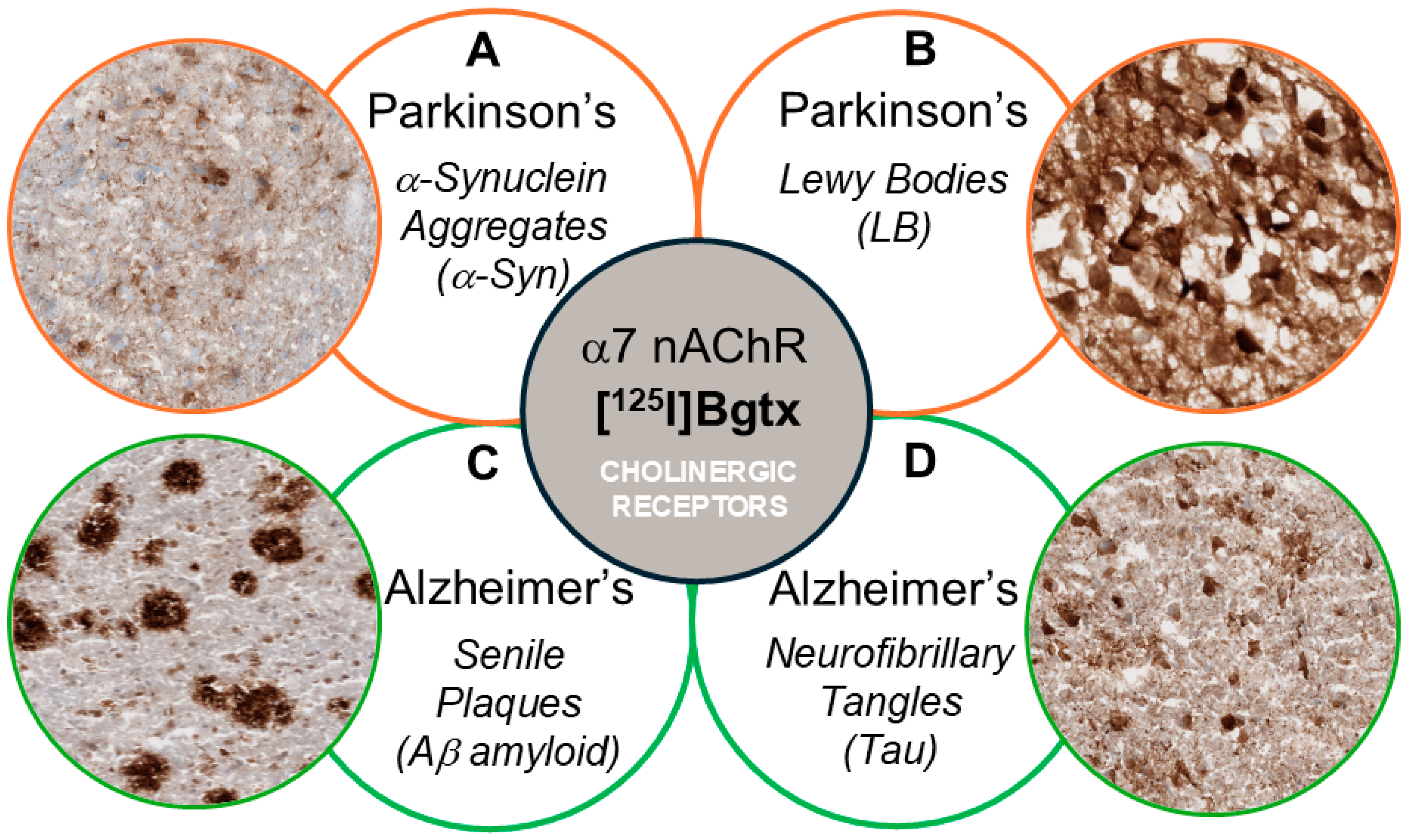- Ngo, A.; Karim, F.; Keerthisinghe, O.V.; Danh, T.B.; Liang, C.; Mukherjee, J. Evaluation of [125I]α-Bungarotoxin Binding to A7 Nicotinic Acetylcholinergic Receptors in Hippocampus–Subiculum of Postmortem Human Alzheimer’s Disease Brain. Receptors 2025, 4, 7. [Google Scholar] [CrossRef] [PubMed]