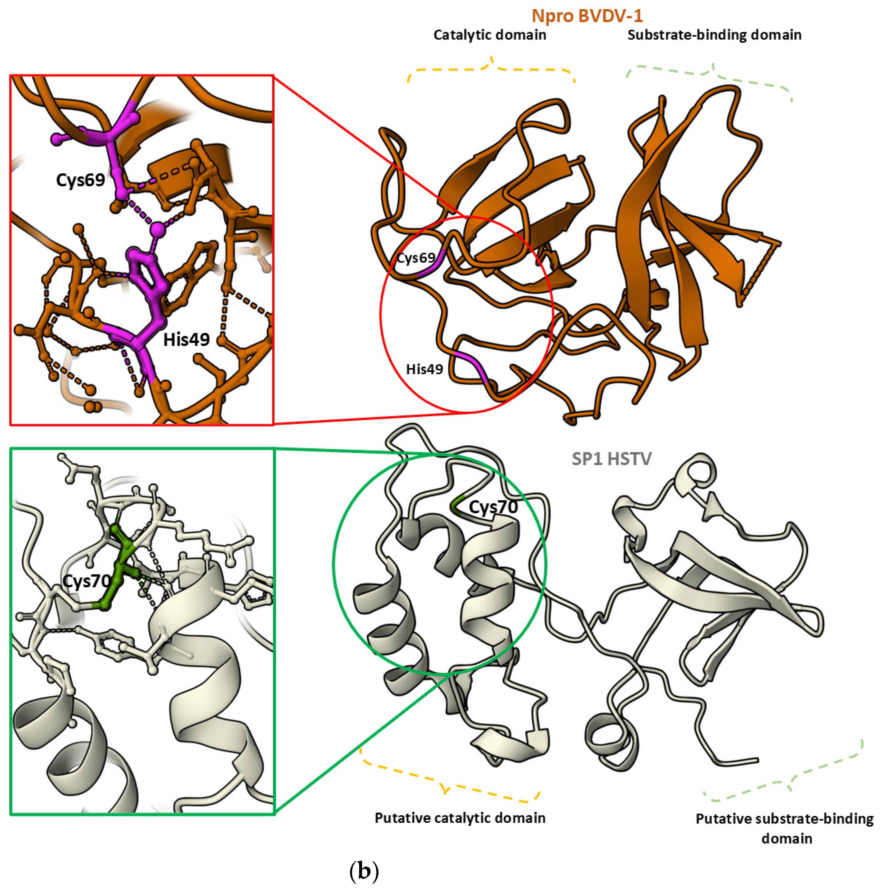 Figure 5. Comparison of primary and tertiary structures of HSTV SP1 with pestiviral Npro. (a) Sequence conservation analysis of HSTV SP1 and pestiviral Npro: red—identical in all sequences residues; yellow—similar residues; white—unaligned residues. Catalytic residues His49 and Cys69 are shown. (b) Structural models of BVDV-1 Npro (PDB ID: 4H9K, orange) with catalytic residues His49 and Cys69 (purple) and HSTV SP1 (gray) with structural position of Cys70 (green).