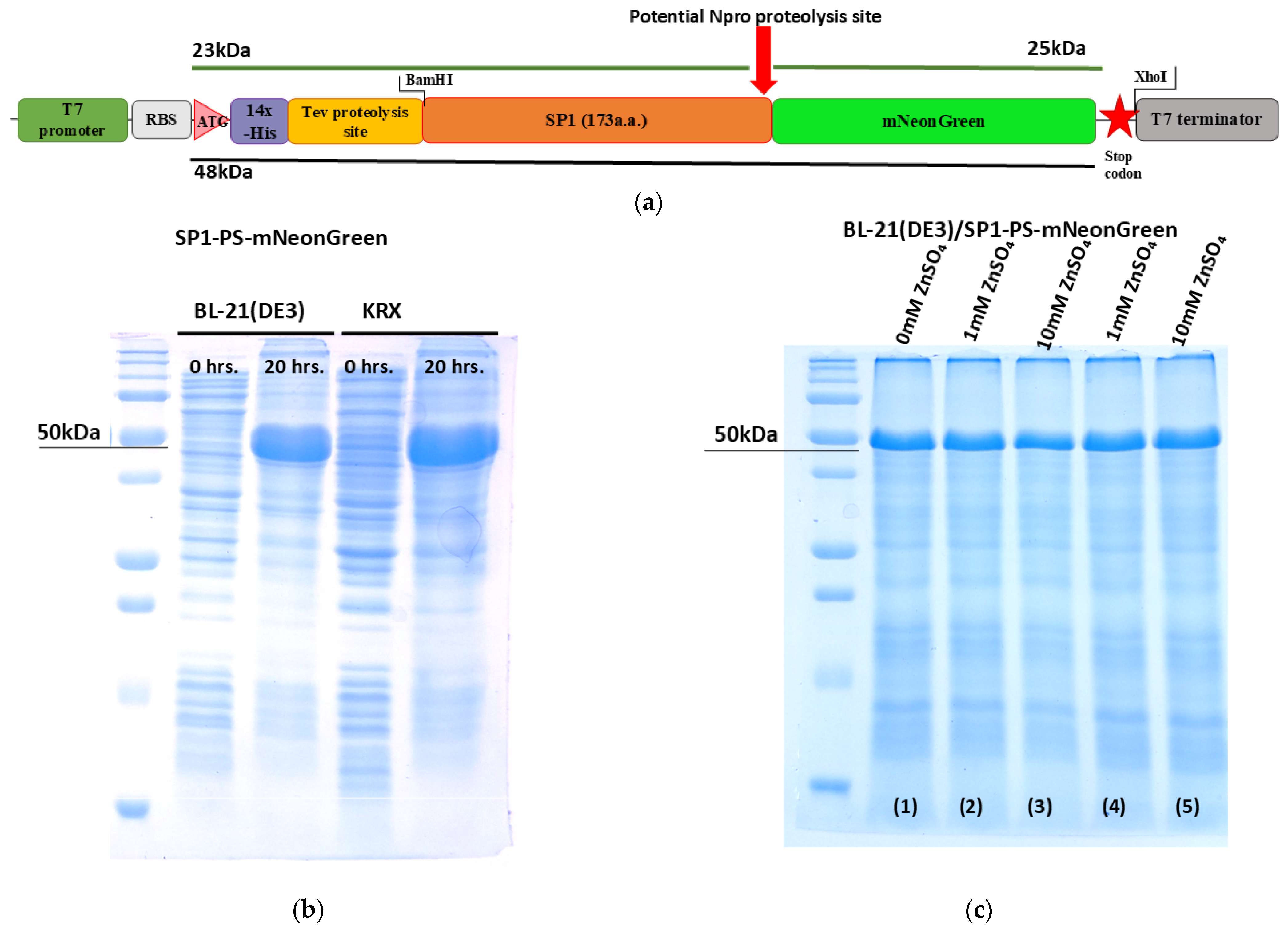 Figure 6. Schematic representation of the chimeric recombinant 14×His-TEV-SP1-PS-mNeonGreen protein designed to assess potential autoproteolytic activity of HSTV SP1. (a) Linear map of the T7-14×His-TEV-SP1-PS-mNeonGreen expression cassette, designed to produce the chimeric recombinant 14×His-TEV-SP1-PS-mNeonGreen protein. The red star indicates the stop codon. (b) SDS-PAGE of total protein lysates from BL21(DE3)/SP1-PS-mNeonGreen and KRX/SP1-PS-mNeonGreen producer strains following induced expression. Lane 0: uninduced control. Lane 20: cells harvested after 20 h. of induction. (c) SDS-PAGE of purified fractions from total protein lysates BL21(DE3)/SP1-PS-mNeonGreen cultured under varying zinc conditions. Lanes: 1—standard conditions cultured strain without ZnSO4; 2—+1 mM ZnSO4; 3—+10 mM ZnSO4; 4—purified protein with 1 mM ZnSO4; 5—purified protein with 10 mM ZnSO4.