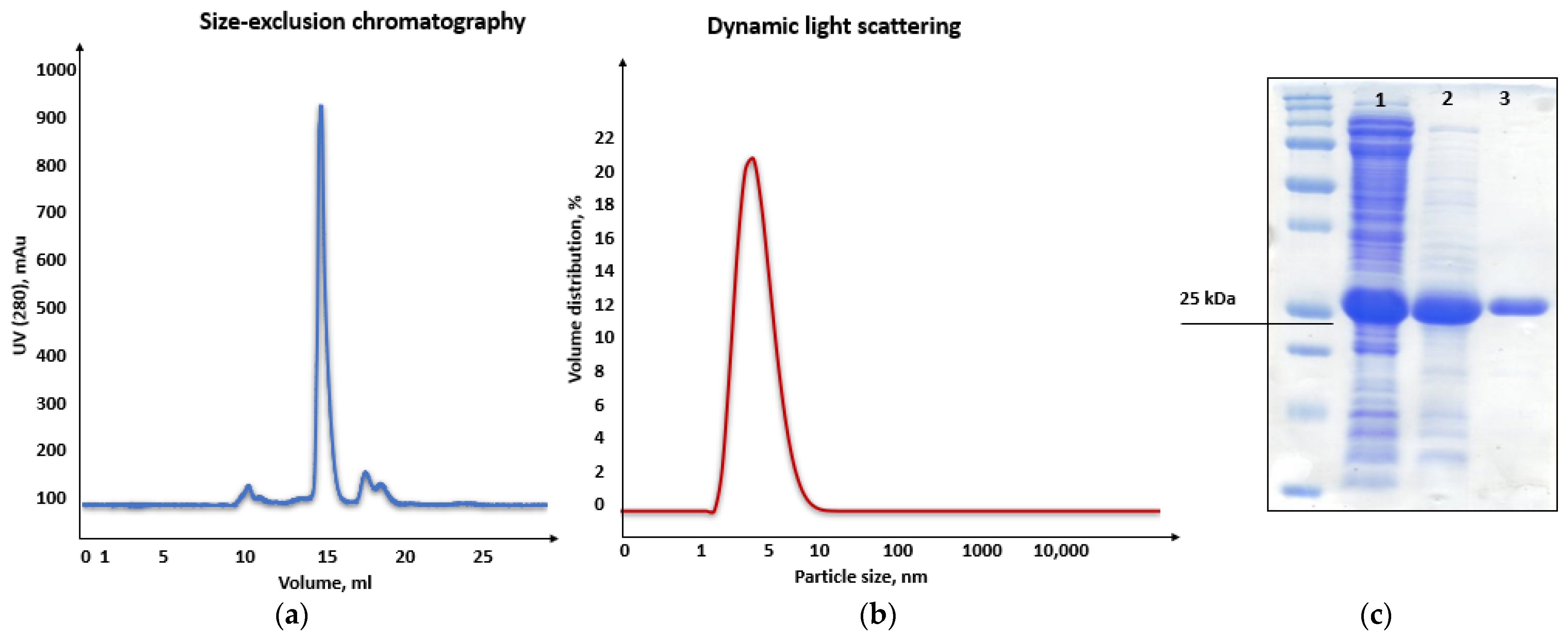 Figure 8. Purification and biophysical characterization of recombinant His-tagged HSTV SP1. (a) Size-exclusion chromatography (SEC) elution profile; (b) Dynamic light scattering (DLS) analysis of the final HSTV SP1, showing a monodisperse population with a hydrodynamic diameter of 4.4 ± 0.1 nm. (c) SDS-PAGE of the purified SP1 fractions: lane 1—cell lysate before purification, lane 2—fraction of proteins after ion-exchange chromatography, lane 3—fraction of SP1 protein after SEC.