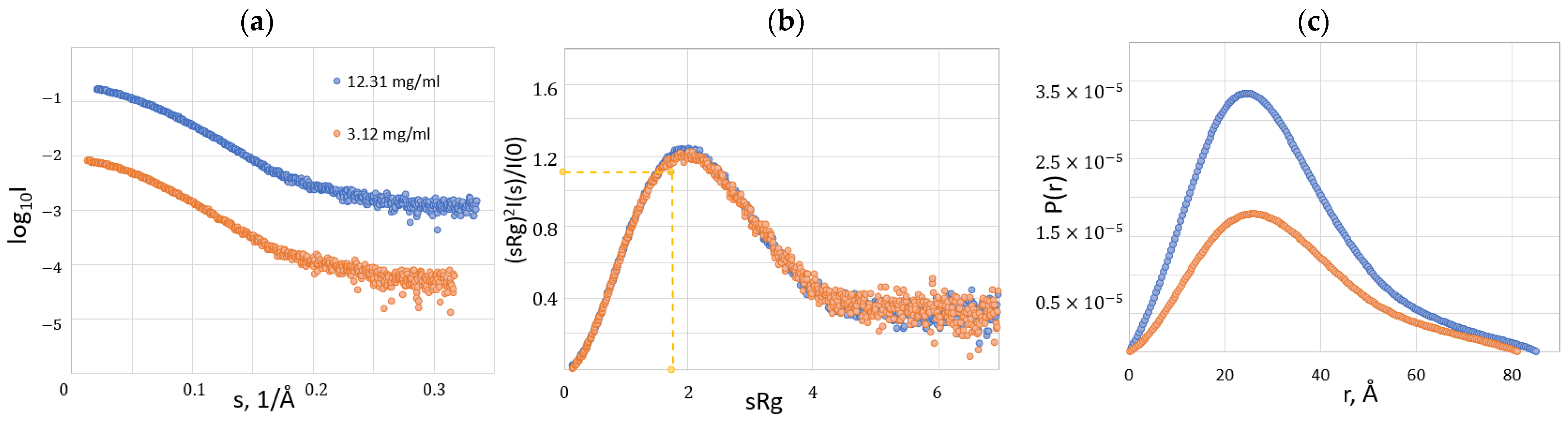 Figure 9. SAXS analysis of the HSTV SP1 at concentrations of 12.31 mg/mL (blue) and 3.12 mg/mL (orange). (a) Experimental SAXS profiles of HSTV SP1. (b) Kratky plot of HSTV SP1. The point marked by the intersection of the yellow dashed lines corresponds to the value expected for a fully folded (globular) protein. (c) Distance distribution function—P(r) of HSTV SP1. All curves are normalized to protein concentration.
