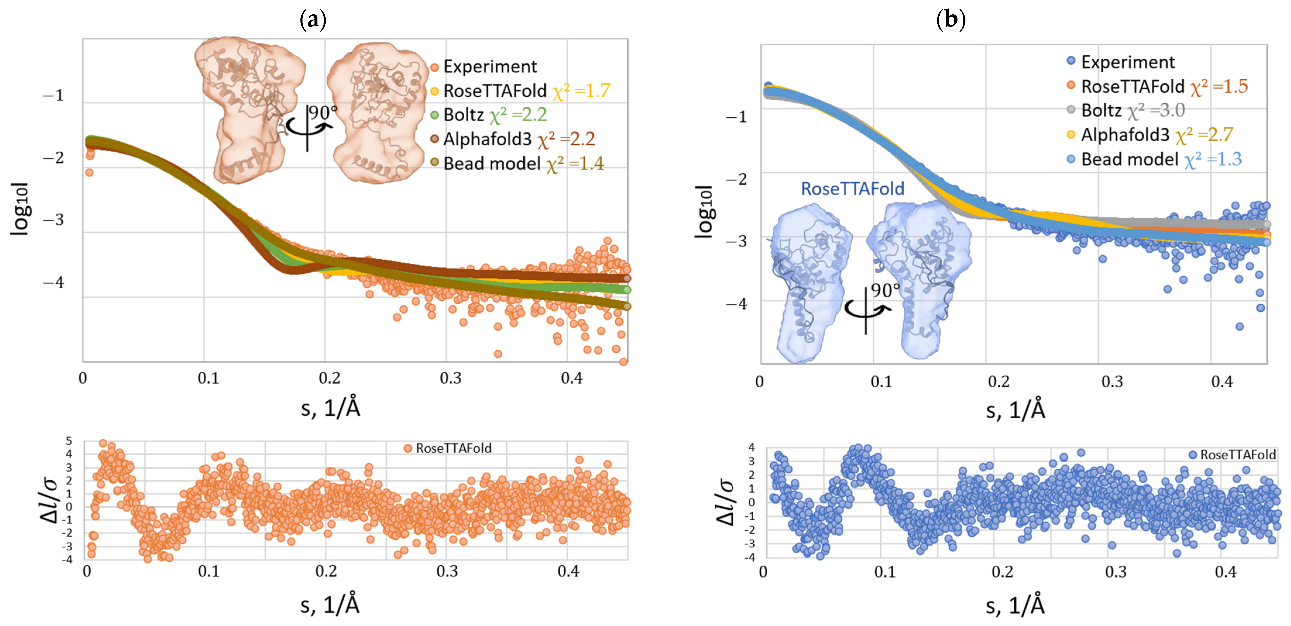 Figure 10. Comparison of experimental SAXS curves (dots) with Crysol-computed scattering profiles from AI-predicted models (RoseTTAFold, Boltz-2, AlphaFold3) and the DAMMIN bead model for HSTV SP1: (a) at concentrations of 3.12 mg/mL (orange) and (b) at concentrations of 12.31 mg/mL (blue). Theoretical fits are colored as labeled, with corresponding χ2 values indicating the goodness-of-fit. Structural models (ribbon representation) are shown above for reference. Each structural model is superimposed onto the corresponding experimental SAXS-derived envelope (transparent orange and blue envelopes). The lower panel displays the normalized residuals (ΔI/σ) between RoseTTAFold-predicted HSTV SP1 model (chosen as the best fit) and experimental data as a function of the scattering vector s.