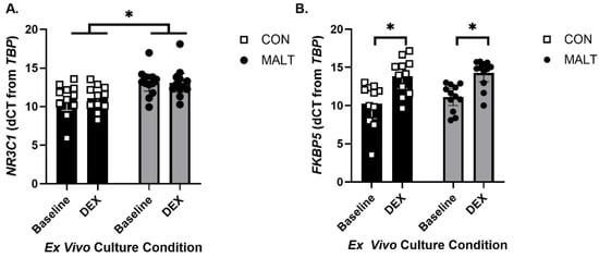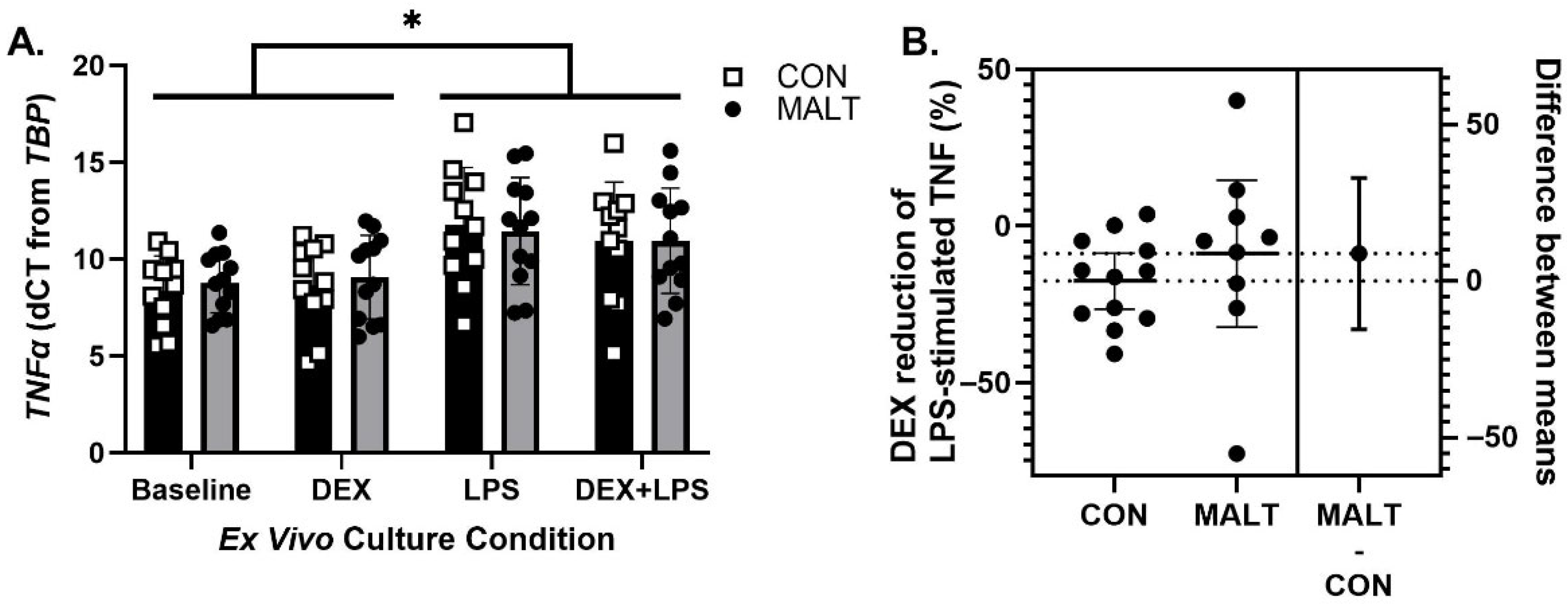 3.3. Ex Vivo TNFα Gene Expression and DEX Suppression of TNFα Protein Was Not Altered by MALT