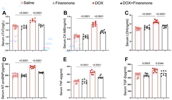 Finerenone reduces serum markers of myocardial injury and fibrosis in DIC mice. (A–C) Markers of myocardial injury: cTnT, CK-MB, and LDH. (D–F) Fibrotic markers: NT-proBNP, TNF-α, and TGF-β. Each group was determined by ELISA kits, n = 8. All results are shown as the mean ± SEM; p-values are indicated.