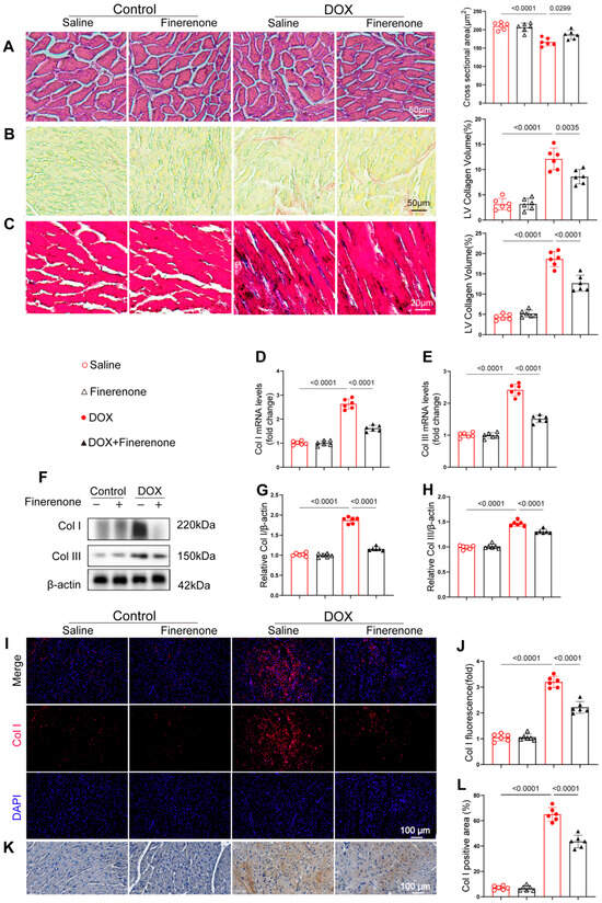 Finerenone mitigates cardiac injury and alleviates cardiac remodeling in DIC mice. (A) Representative images of H&E-stained sections and quantification of the cardiomyocytes’ cross-sectional area. (B) Picric Sirius red (PSR) staining and quantification of the LV collagen volume. (C) Representative cardiac Masson trichrome staining and quantification of the LV collagen volume. (D,E) PCR was used for mRNA quantitative analysis of Col I and Col III. Normalized to β-actin, n = 6. (F–H) Western blot analysis and quantification of Col I and Col III, n = 6. (I–J) Representative images of immunofluorescence staining and quantification of fluorescence intensity for Col. (K–L). Representative images of immunohistochemistry staining and quantification of positive area for Col I. All results are shown as the mean ± SEM; p-values are indicated.