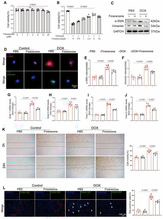 Effect of Finerenone on EndMT and proliferation in vitro. (A) Cell viability after treatment with different Finerenone doses, measured by CCK8, n = 6. The horizontal lines indicate a comparison between the two endpoint groups. (B) Cell viability after treatment with different Finerenone doses in the presence of DOX, measured by CCK8, n = 6. The horizontal lines indicate a comparison between the two endpoint groups. (C) Representative Western blot images showing the expression of α-SMA and vimentin, n = 6. (D–F) Immunofluorescence staining for α-smooth muscle actin (α-SMA) and vimentin was performed, and the fluorescence intensity of each marker was quantified. (G–J) PCR was used for mRNA quantitative analysis of twist1, twist2, snial1 and snial2, normalized to β-actin in vitro, n = 6. (K) Cell migration capacity was assessed using a scratch assay. (L) NRCFs were stained for EdU, and EdU-positive cells were quantified. Hoechst is used to label all nuclei (blue). Azide 488 for Specifically Labeling the Nuclei of Proliferating Cells (Green). All results are shown as the mean ± SEM; p-values are indicated.