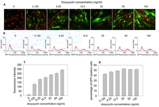 An increasing number of GFP-positive cells was observed when transduced DPSCs were visualized by confocal microscopy (Figure 1A) and analyzed by flow cytometry (Figure 1B–D) after 7 days of treatment with increasing concentrations of doxycycline. GFP fluorescence intensity increased proportionally with the doxycycline concentration (Figure 1C), whereas the percentage of GFP-positive cells reached a plateau at 25 ng/mL doxycycline (Figure 1D).