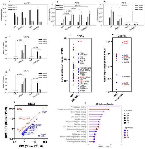 RT-qPCRanalysis of transduced DPSCs and differentially expressed genes in BMP2/7 heterodimer-expressing cells. (A) RUNX2 expression in transduced DPSCs cultured in CM, CM + DOX, OIM, and OIM + DOX for one, two, or three weeks. (B) ALPL expression in transduced DPSCs cultured in CM, CM + DOX, OIM, and OIM + DOX for one, two, or three weeks. (C) NOG expression in transduced DPSCs cultured in CM, CM + DOX, OIM, and OIM + DOX for one, two, or three weeks. (D) BMP2 expression in transduced DPSCs cultured in CM, CM + DOX, OIM, and OIM + DOX for one, two, or three weeks. (E) BMP7 expression in transduced DPSCs cultured in CM, CM + DOX, OIM, and OIM + DOX for one, two, or three weeks. (F) Differentially expressed genes (DEGs) that up- or downregulated upon BMP2/7 overexpression (+DOX). Red dots show upregulated genes while blue dots show downregulated genes (fold difference (FD) > 2, red; 2 > FD > 1.5, light red; FD < 1/2, blue; 1/2 < FD < 2/3, light blue). (G,H) Changes in the expression of osteogenic differentiation-related genes, and BMP and BMPR genes in BMP2/7-expressing DPSCs. Red dots show upregulated genes while blue dots show downregulated genes. Dot-and-line plots represent normalized FPKM values of osteogenesis-related differentially expressed genes (DEGs) (G) and BMP/BMPR genes (H) upon BMP2/7 overexpression (+DOX). (I) GO terms (molecular functions) enriched in the DEGs. The height of the bars represents the mean, and the error bars represent the standard deviation of three parallel measurements. One-way ANOVA with the Bonferroni post hoc test was used for statistical analysis.