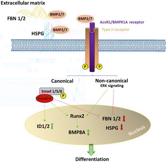Possible mechanisms of BMP2/7 heterodimer action on transduced DPSCs. Among the genes differentially expressed in response to BMP2/7 heterodimer action in DPSCs, the increase in ID1, ID2, and BMP8A and the decrease in FBN1/2 and HSPG represent changes that support enhanced differentiation (Green arrows indicate gene activation and red arrows indicate gene repression).