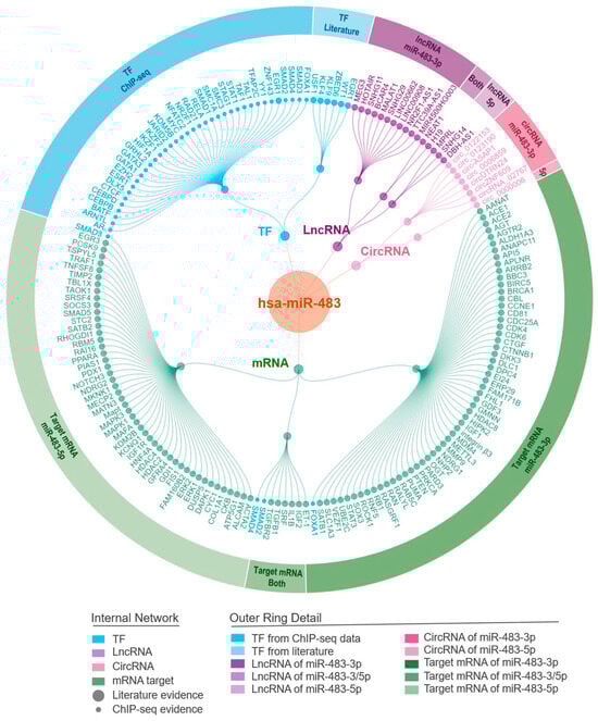 Integrative regulatory network centered on miR-483. The network integrates 65 upstream regulators (circRNAs, lncRNAs, and TFs) and 114 downstream targets (58 specific to miR-483-3p, 48 to miR-483-5p, 8 shared). Node colors of internal network indicate regulatory roles: blue for transcription factors, purple for lncRNAs, pink for circRNAs, green for mRNA targets. Size of nodes indicated the evidence level of interactions. Outer ring provides detailed classifications for subset groups. Network visualization performed using R software (v4.5.2).