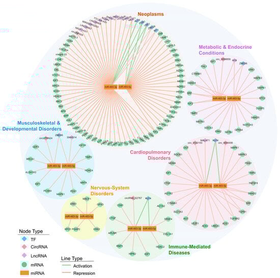 miR-483 regulated six disease-specific subnetworks: neoplasms, cardiopulmonary, metabolic & endocrine, immune/autoimmune, nervous system, and musculoskeletal & developmental. Node shapes and colors represent regulatory categories: blue squares for transcription factors, pink squares for circRNAs, purple squares for lncRNAs, green circles for mRNA targets, and yellow rectangles for miRNAs. Edge colors indicate the mode of regulation: green edges represent transcriptional activation of miR-483 by upstream TFs, while red edges denote repressive interactions, including lncRNA/circRNA sequestration or miRNA-mediated mRNA suppression.