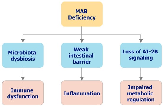 A diet deficient in MABCs destabilizes the HMS and disrupts B-dependent QS (notably AI-2B), leading to a cascade of deficits across four interrelated domains:
