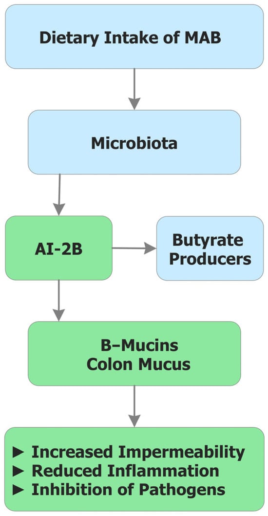 These mechanisms are integrated in Figure 3, which schematically illustrates how MAB operate at the microbiome–mucus interface. The figure connects three interdependent functions—AI-2B-mediated QS, mucin reinforcement through reversible borate–diol crosslinking, and SCFA-centered metabolic ecology—showing how local B availability orchestrates microbial stability, barrier integrity, and systemic homeostasis.