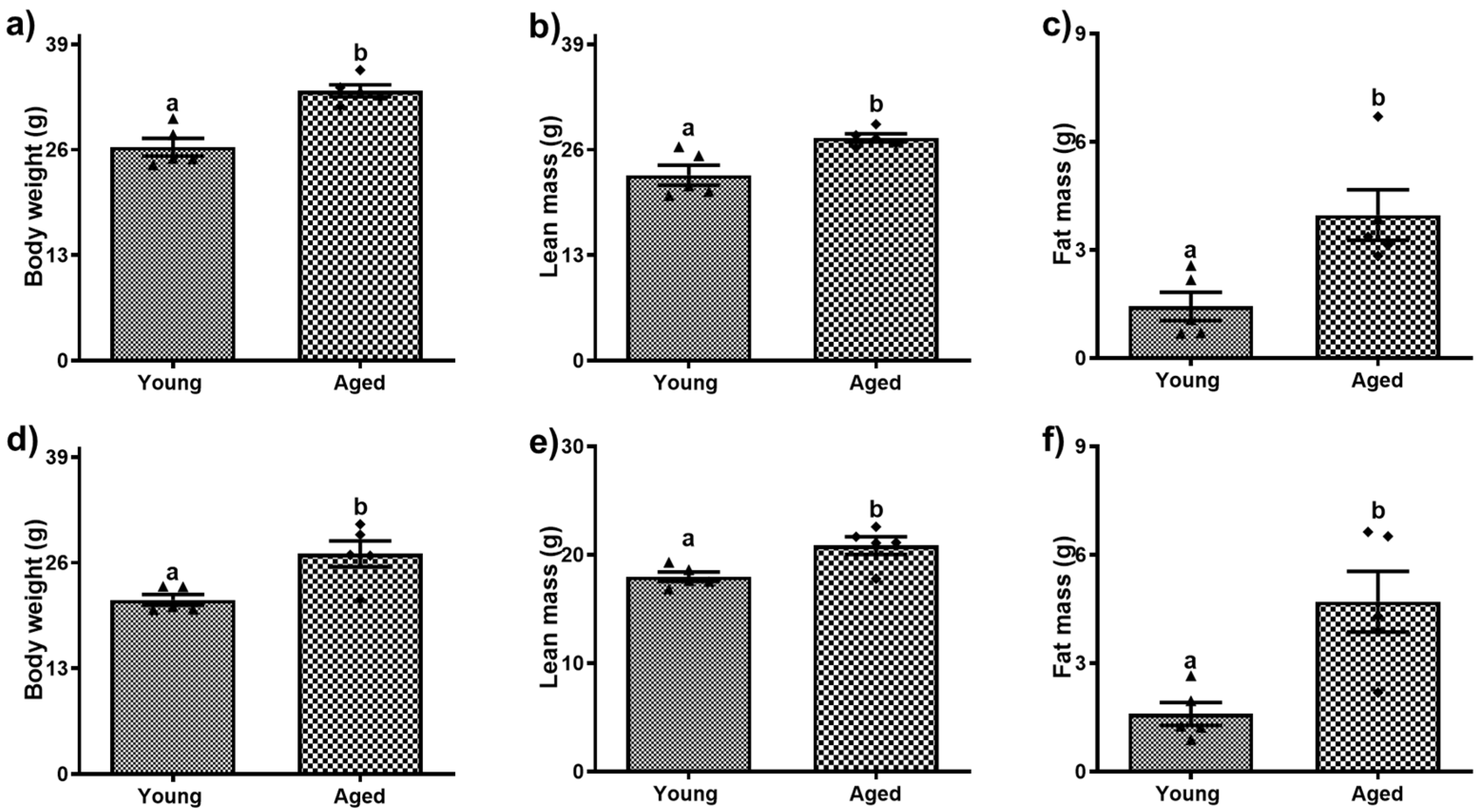 3.1. Aging Leads to Changes in Body Weight, Lean Mass, and Fat Mass