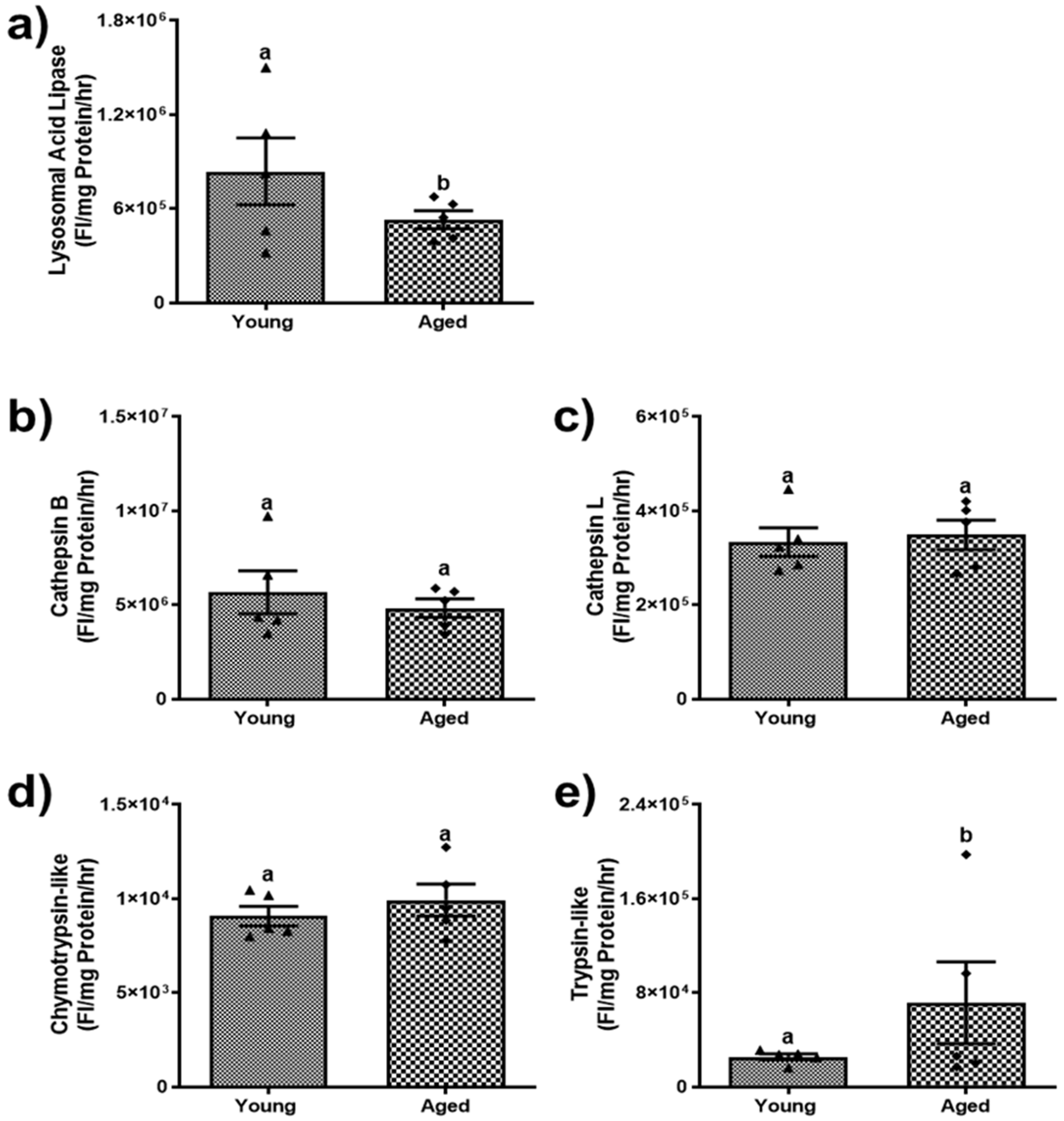 3.3. Aging Modulates Lysosomal and Proteasomal Enzyme Activities