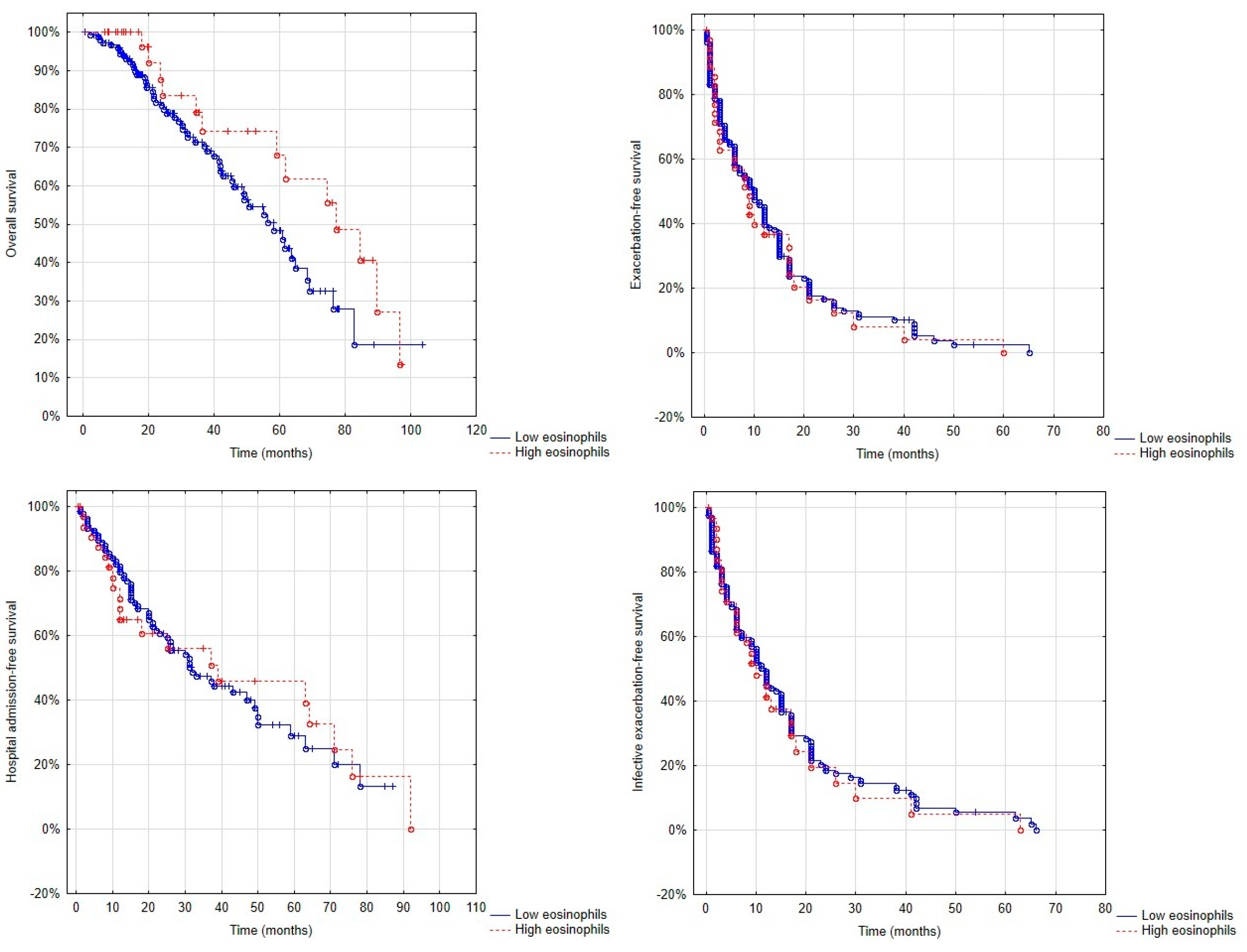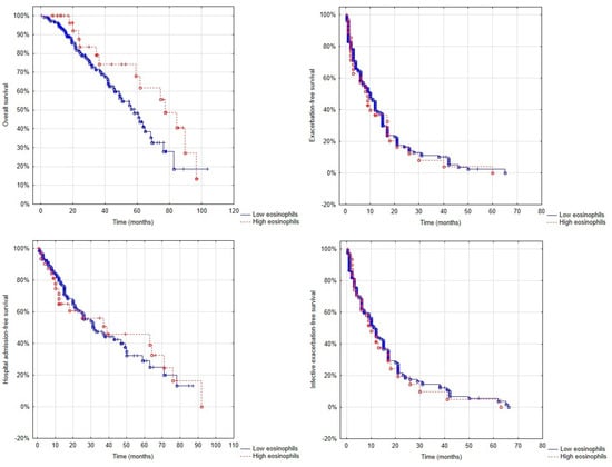 3.3. Overall Survival, Exacerbation-Free Survival and Hospitalisation-Free Survival in Patients with and Without the Eosinophilic Phenotype