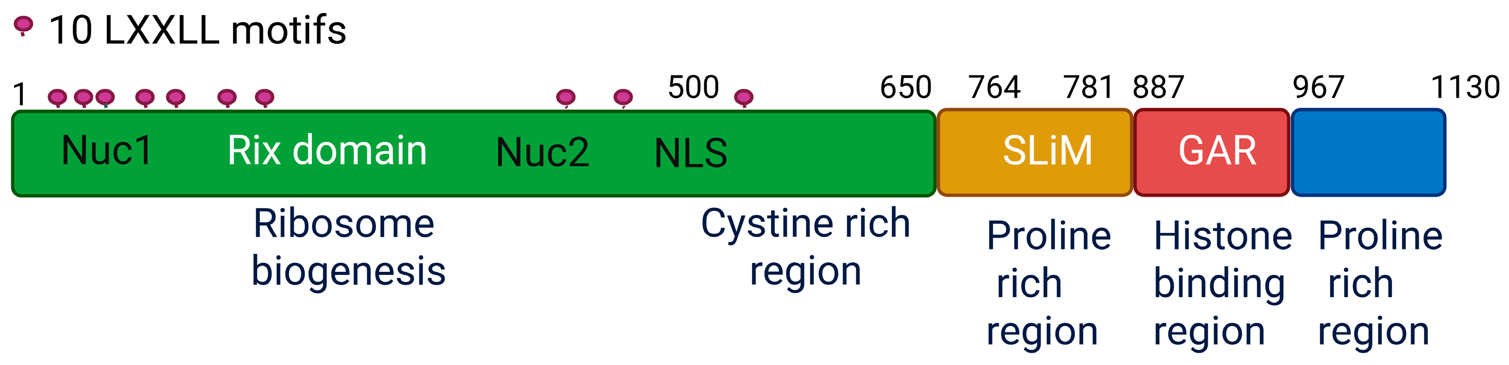 Figure 1. Structural composition of the human PELP1 protein and its functional domains. Schematic depiction of PELP1 (amino acids 1–1130) highlighting its principal domains and motifs. The N-terminal region (1–650 aa) encompasses the Rix domain, essential for ribosome synthesis, and contains several LXXLL motifs (totaling 10) that facilitate interactions with nuclear receptors. This area contains a nuclear localization signal (NLS) that enables nuclear transport and two nucleolar localization motifs, Nuc 1 (79–160 aa) and Nuc 2 (423–489 aa), which help localize PELP1 in the nucleolus. The cysteine-rich region (500–650 aa) coincides with the Rix domain. The central segment (650–887 aa) contains a brief linear motif (SLiM; 764–781 aa) that facilitate SENP3 interaction. The GAR (glutamic acid rich) domain (887–966 aa) is associated with histone binding and chromatin remodeling. The C-terminal segment (967–1130 aa) has a second proline-rich region, which is linked to scaffolding functions.
