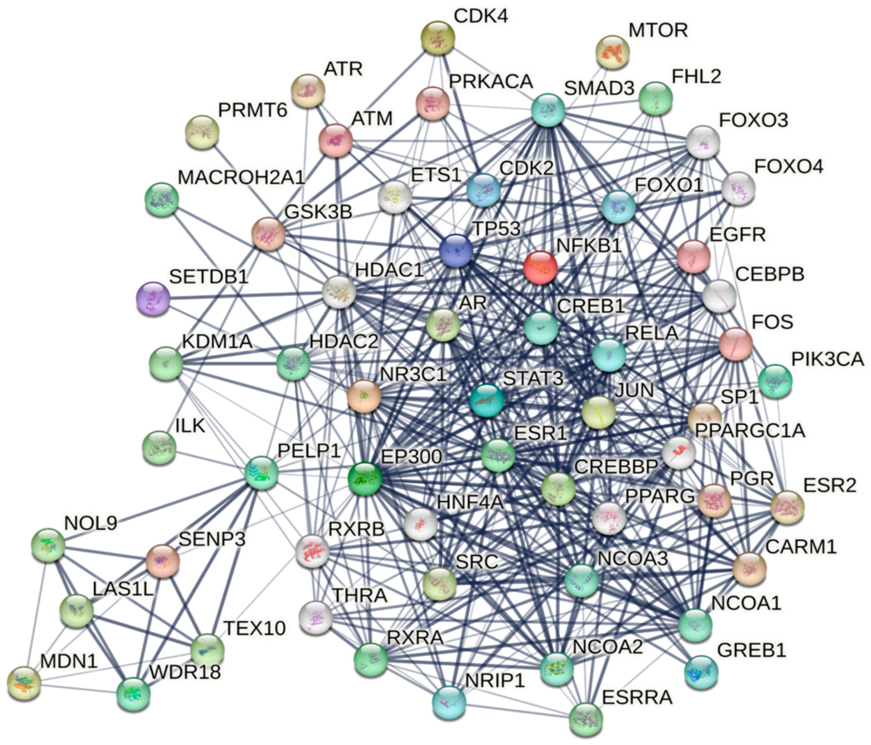 Figure 2. PELP1 interaction network and its associated partners. The figure illustrates experimentally validated and highly probable predicted protein partners of PELP1, derived from the STRING database (interaction confidence ≥ 0.7). PELP1 is the central molecule, linking multiple functional clusters vital for NR signaling, chromatin remodeling, kinase signaling, DNA damage response, and cell cycle regulation. Nuclear receptors (ERα/ESR1, ERβ/ESR2, AR, PR, GR/NR3C1, RXRα, RXRβ, and PPARG) and chromatin modifiers (EP300, CREBBP, NCOA1–3, KDM1A/LSD1, SETDB1, HDAC1/2, PRMT6, CARM1, MACROH2A1, and SENP3), along with transcription factors (STAT3, NFκB1, CREB1, SP1, TP53, and HNF4A), interact with PELP1. The PELP1 network also encompasses components involved in ribosome biogenesis (MDN1, TEX10, WDR18, LAS1L, NOL9) as well as kinases (SRC, EGFR, CDK2/4, AKT/GSK3β, and MTOR). These interactions underscore PELP1's scaffolding function in oncogenic signaling.