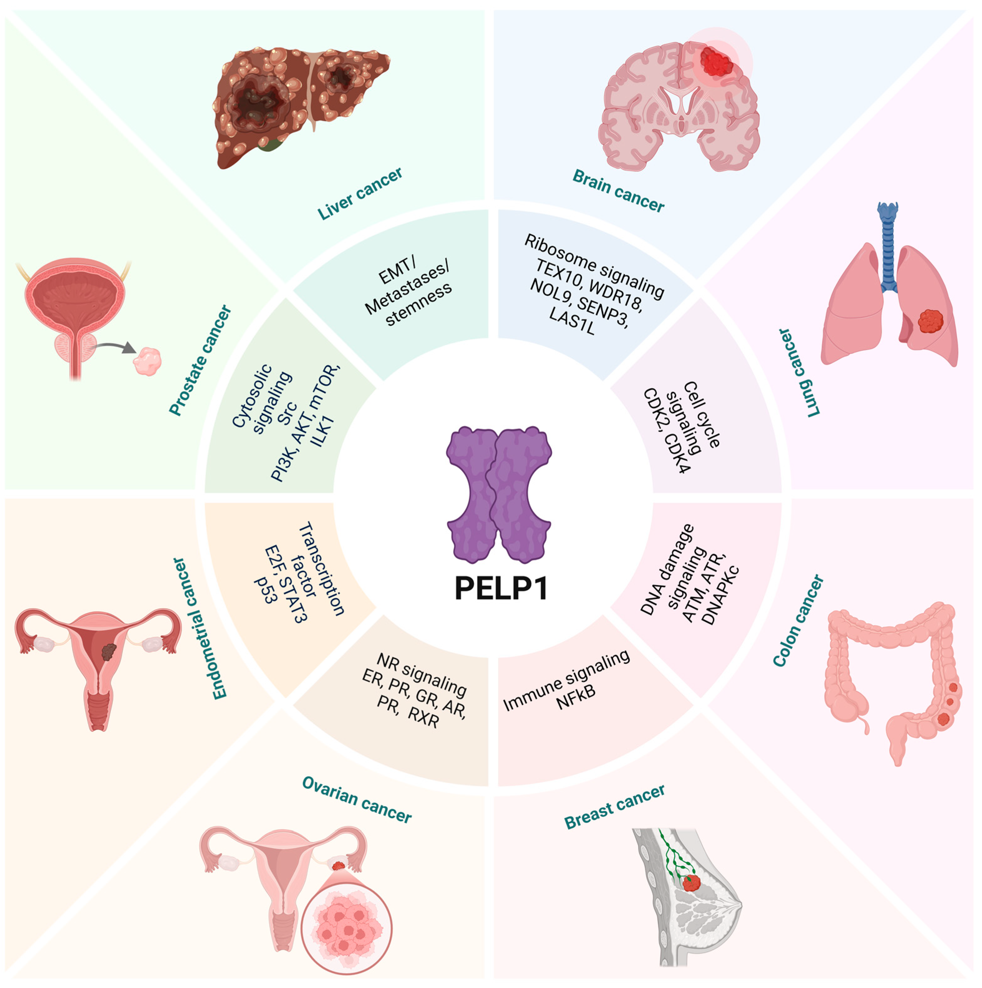 Collectively, these findings suggest that PELP1 functions as an oncogenic scaffold that integrates NR signaling, cytoplasmic kinase pathways, chromatin remodeling, and ribosome biogenesis, positioning it as a central regulator of transcriptional and translational programs in cancer.