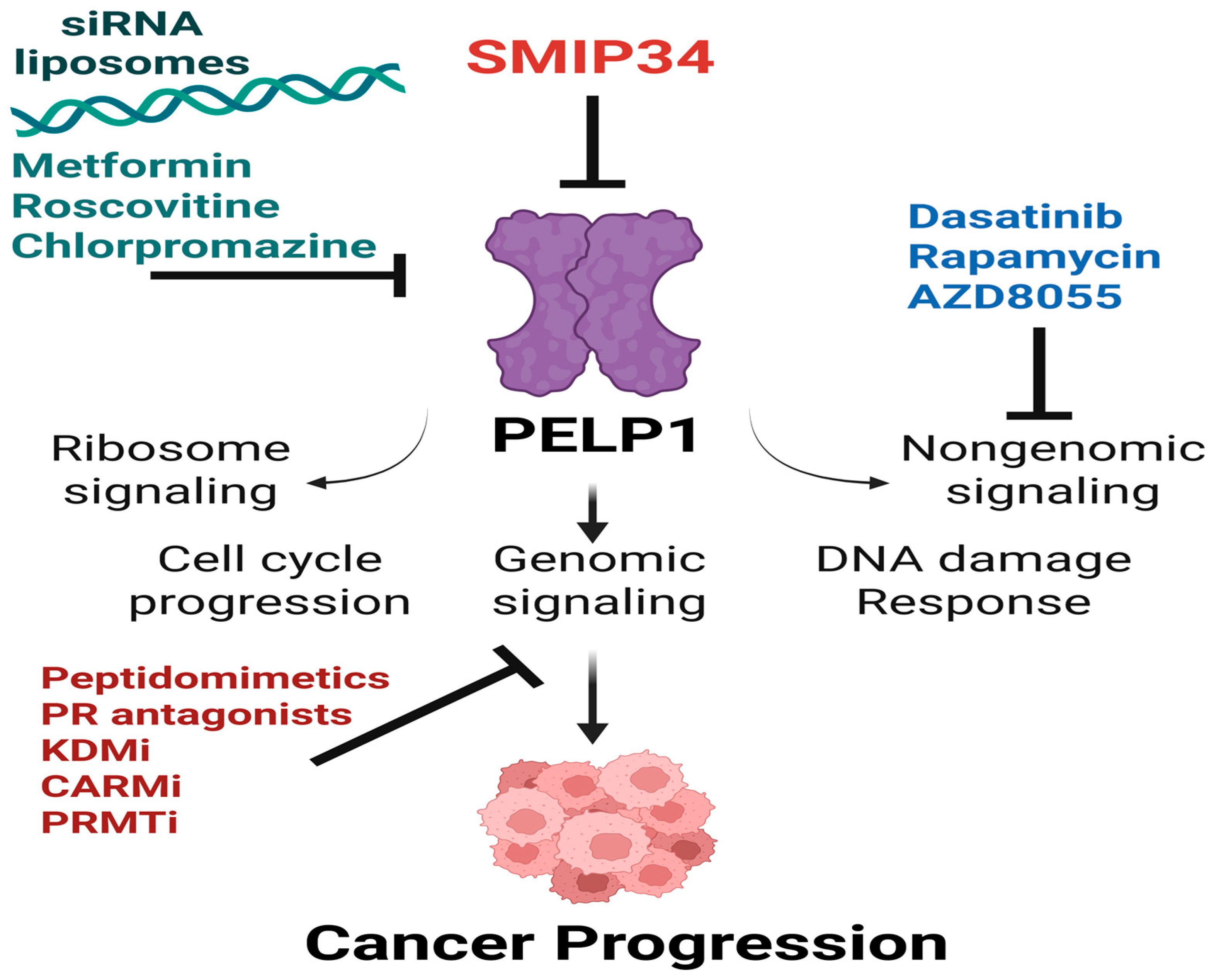 Figure 4. A schematic view of multiple pharmacological and molecular techniques designed to inhibit PELP1 oncogenic signaling pathways. Small molecules like SMIP34 directly target PELP1, destabilizing and promoting its degradation. Gene silencing by PELP1 siRNA-loaded liposomes significantly reduces tumor growth in preclinical models. Further, indirect suppression of PELP1 expression by repurposed drugs such as metformin, roscovitine, and chlorpromazine is also shown to reduce PELP1 effects in cancer cells. Non-genomic PELP1 signaling can be inhibited by Dasatinib, Rapamycin, and AZD8055, targeting PELP1-associated cytoplasmic kinases as well as mTOR pathways. Peptidomimetics, progesterone receptor (PR) antagonists, and epigenetic enzyme inhibitors (KDMi, CARMi, and PRMTi) are effective in blocking PELP1 genomic functions by controlling PELP1-driven transcription and chromatin regulatory actions. Overall, these approaches establish PELP1 as an important therapeutic target and support the concept of PELP1 targeting for treating solid cancers.
