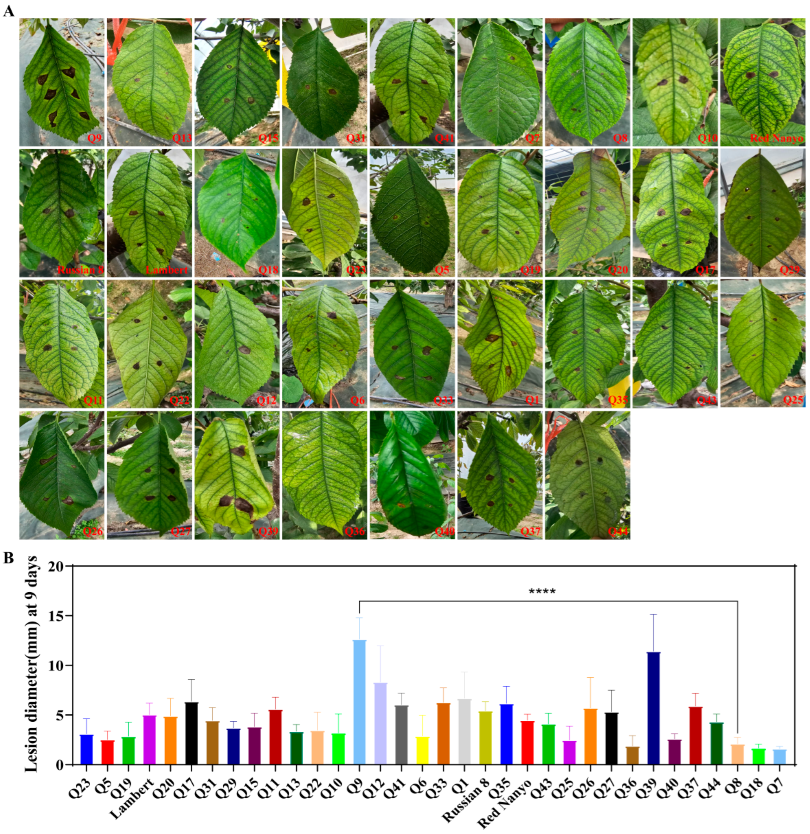 3.2. Confirmation of BSD Resistance in Resistant Sweet Cherry Cultivar Q8 and Susceptible Cultivar Q9