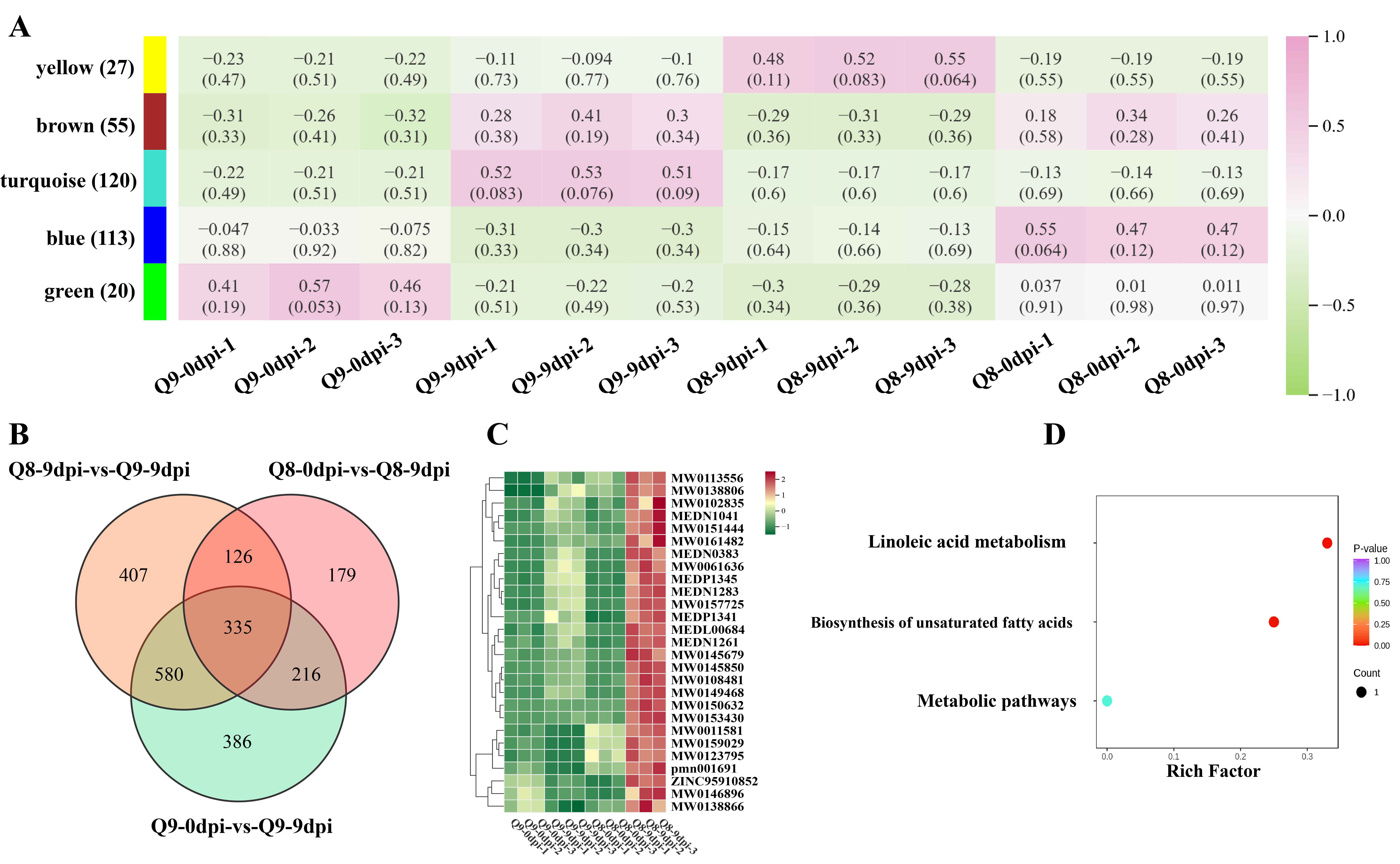 3.3. Physiological Changes in Leaves of Resistant Sweet Cherry Cultivar Q8 and Susceptible Cultivar Q9 Under BSD Infection
