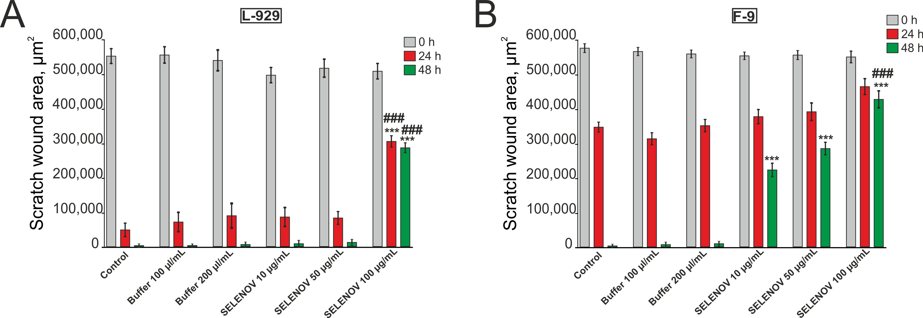 Cell migration was assessed using a standardized wound healing assay. Cells were seeded in 24-well plates (at a density of 1.0 × 105 cells per well) and cultured until reaching 90% confluence under normal growth conditions. A uniform linear scratch was created in the cell monolayer using a sterile 200 μL pipette tip. After wounding, wells were gently washed with phosphate-buffered saline (PBS) to remove detached cells, followed by replacement with low-serum DMEM (2% FBS) to minimize proliferation effects. Experimental treatments consisting of various SELENOV concentrations or equivalent volumes of protein solvent buffer were then added to the cultures.