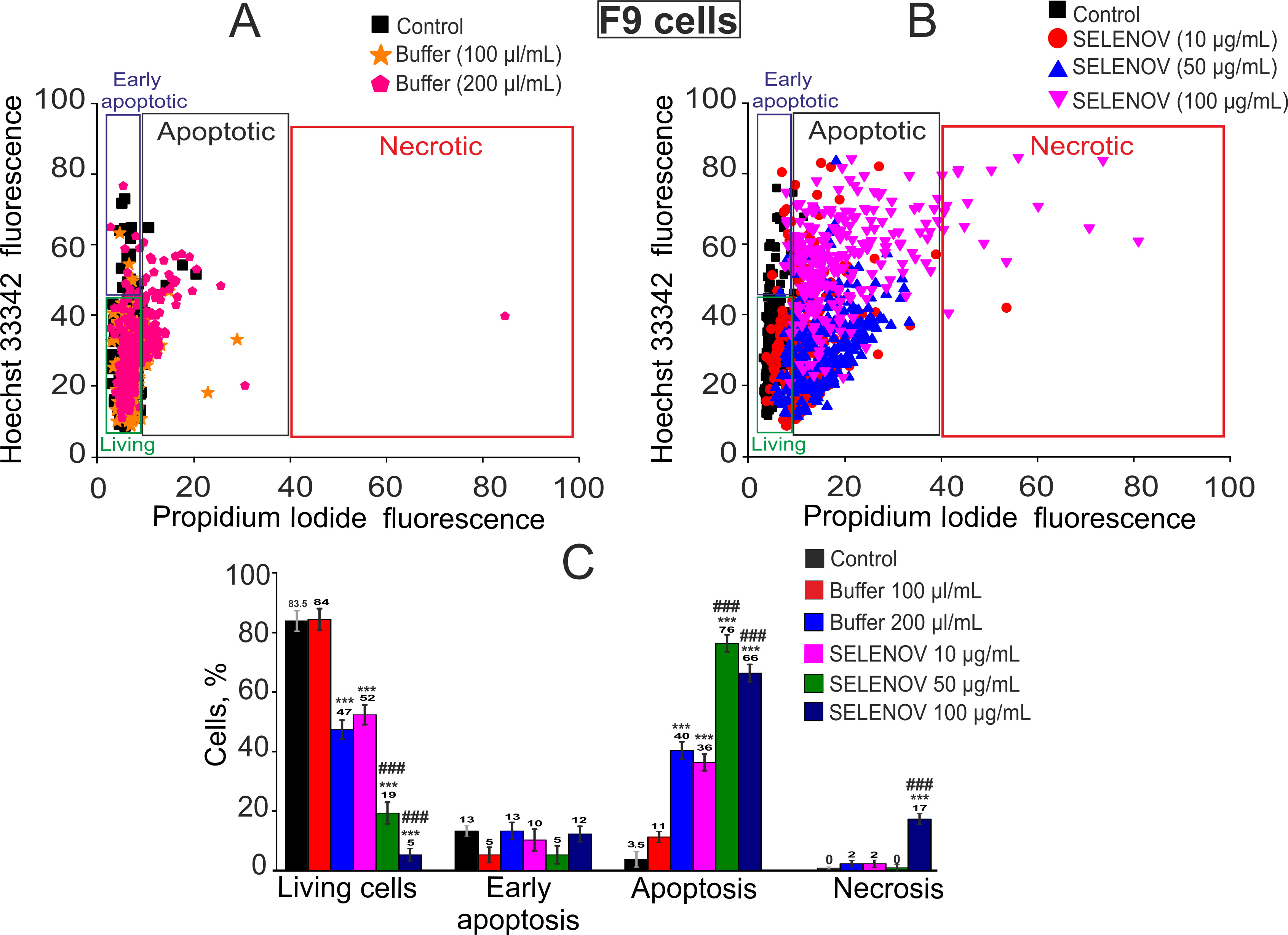 For simultaneous apoptotic/viable cell monitoring post-SELENOV treatment, we used an Annexin V-AF 488 Apoptosis Detection Kit (Lumiprobe) with propidium iodide and CytoCalcein 450. Cells were cultured in 35 mm Petri dishes to confluence before treatment with SELENOV concentrations or vehicle control. After 24-h exposure, cells were trypsinized and processed according to the manufacturer’s protocol: washed with chilled PBS (pH 7.4) and 1× binding buffer, then resuspended in cold 1× binding buffer. Aliquots (100 μL of 1 × 105–1 × 106 cells/mL) were incubated with 5–10 μL Annexin V-AF 488 for 10–15 min (room temperature, dark). Without washing, 400 μL 1× binding buffer was added followed by 1 μL each of propidium iodide and CytoCalcein 450 (5-min incubation, dark). Samples were maintained at 2–8 °C in darkness and analyzed within 4 h using fluorescence microscopy: apoptotic cells (FITC channel, Ex490/Em525 nm), necrotic cells (PI, Ex550/Em650 nm), and viable cells (violet channel, Ex405/Em450 nm). For analysis of images obtained with the Annexin V/PI and Hoechst 33342 kits, positive fluorescence thresholds were established based on the signal of negative controls (unstained cells) and remained constant for all samples within a single analysis run. Cells were considered Annexin V-positive or PI-positive if the fluorescence intensity exceeded the level established for the unstained control, according to the kit manufacturer’s standard protocol.