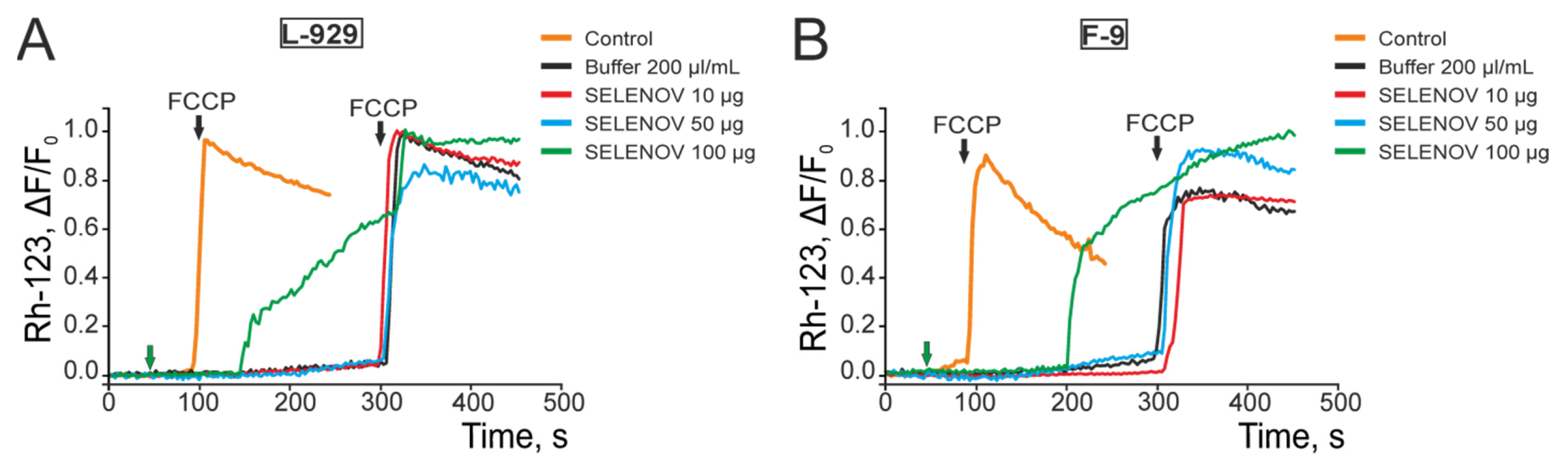27]. Interestingly, in F-9 cells, the mitochondrial potential did not recover after exposure to high SELENOV concentrations, indicating profound disturbances in mitochondrial function, which is a primary prerequisite for an energetic crisis in the cell. A key question arising from our study is the primary site of exogenous SELENOV action—whether it initiates signaling at the cell surface or exerts its effects intracellularly. While our experimental design was focused on characterizing the phenotypic consequences of SELENOV treatment rather than tracing its cellular localization, the nature of the observed effects provides strong clues. The rapid induction of sustained intracellular Ca