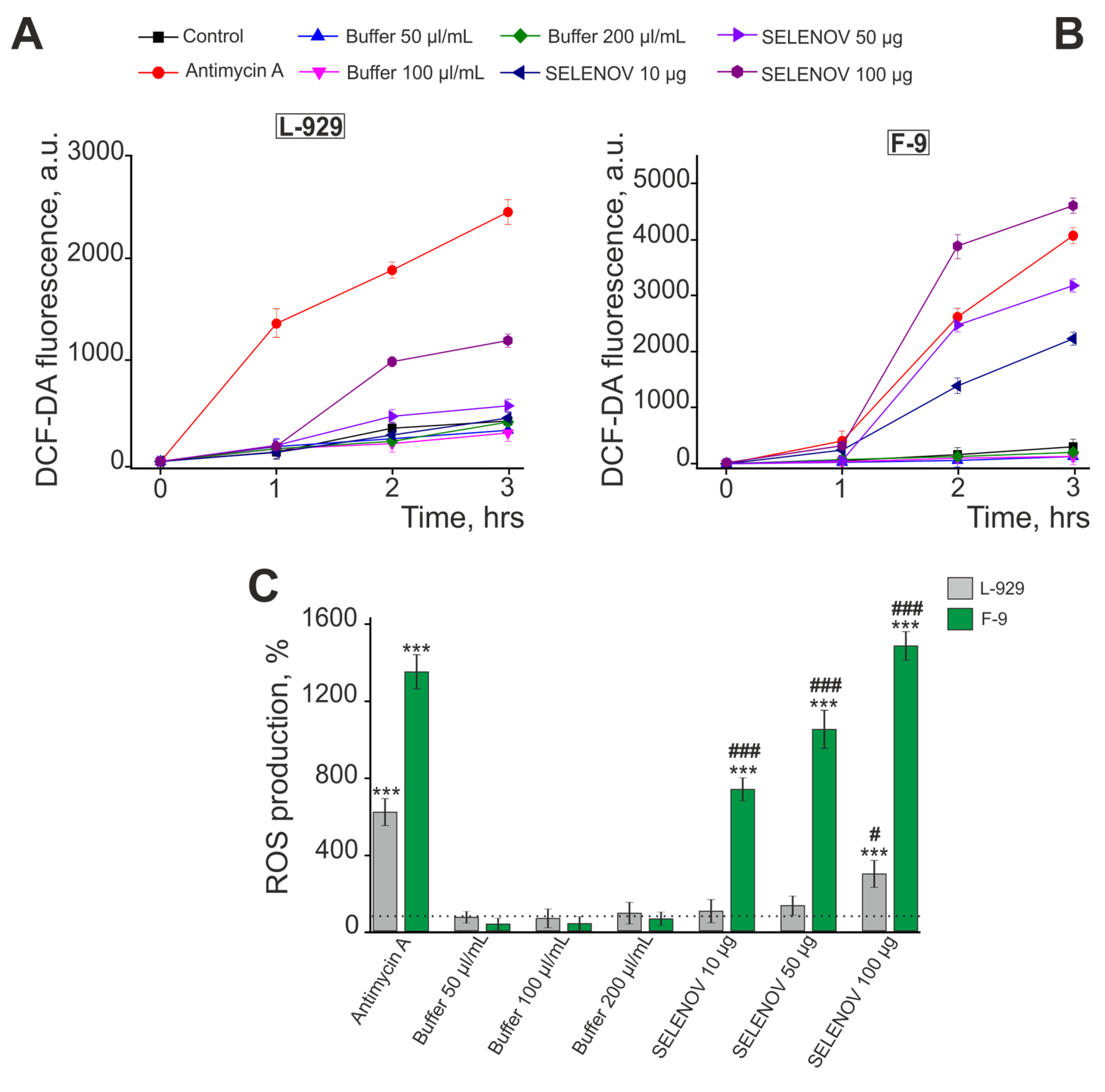 53]. The obtained results open prospects for further study of SELENOV as a potential antitumor agent, but require additional research to clarify its molecular mechanisms of action and evaluate possible therapeutic potential. A key methodological limitation of the present study is the toxicity of the protein solvent buffer at high volumes (200 µL/mL), which confounds the effects of the highest SELENOV dose (100 µg/mL). While we have controlled for this by using buffer-only groups and have based our core conclusions on doses where the vehicle was non-toxic (e.g., 50 µg/mL in F-9 cells), this issue underscores the importance of developing alternative delivery formulations for future in vivo studies.
